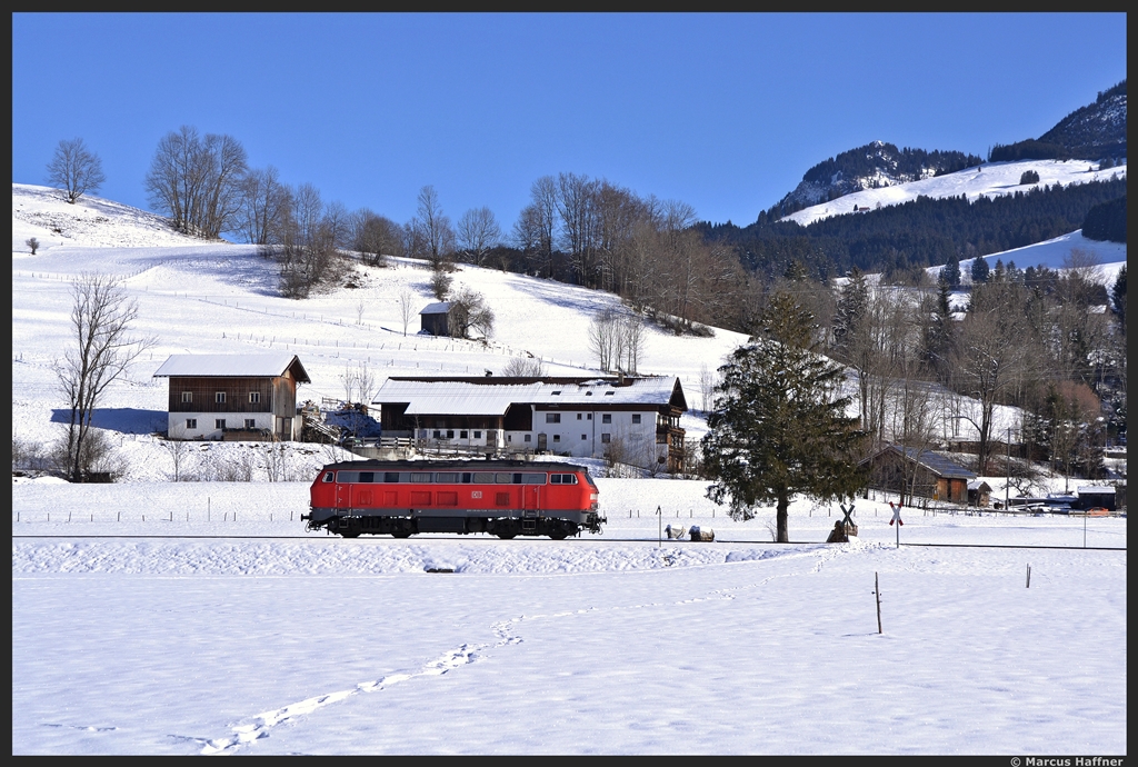 Ein Alex zwischen Immenstadt und Oberstdorf, gezogen von 218 391. Die 218 ist außerplanmäßig vor dem Alex, aufgenommen am 01.01.2013 kurz vor Oberstdorf. mathias