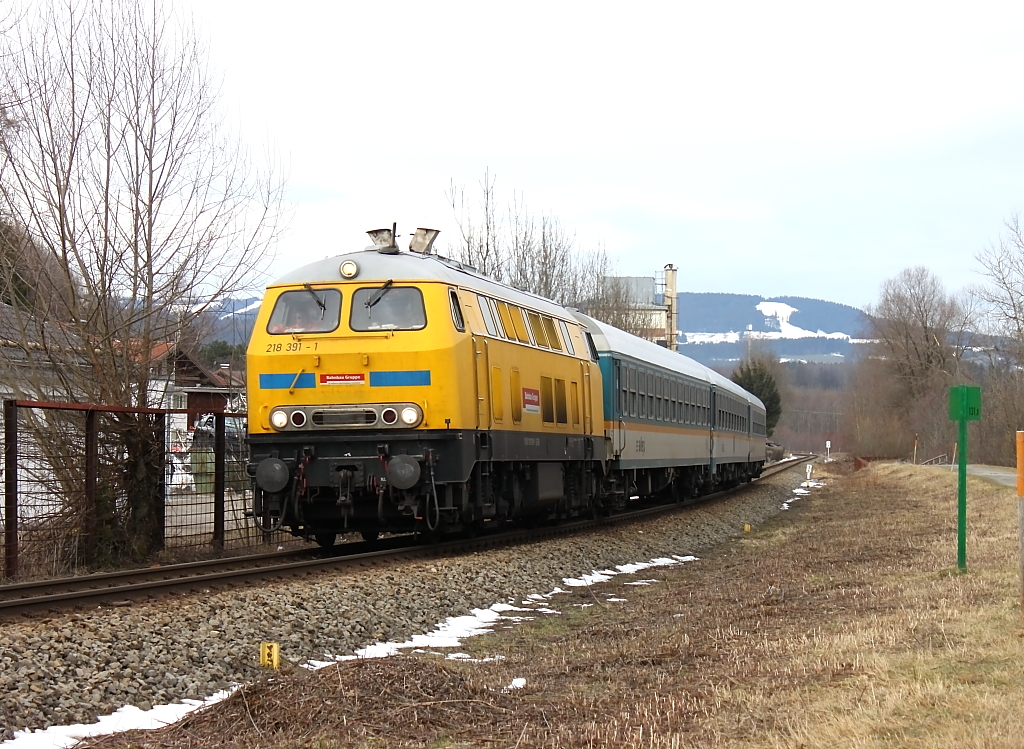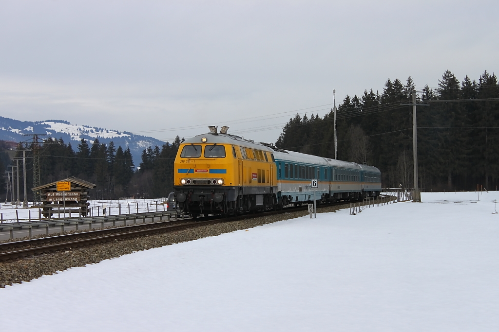 Wer vor ein paar Jahren behauptet hätte, dass eine 218 mal vor dem ALEX zum Einsatz kommen würde, wäre wohl nur schief angeschaut worden. Ende 2012 wurde dieses Szenario aber Wirklichkeit und die gelbe 218 391-1 der Bahnbau Gruppe machte sich auf ins Allgäu, um sich dort mal wieder vor Personenzügen zu versuchen. Am 31.12.2012 stand dabei unter Anderem der ALX 84166 auf dem Plan, welchen ich bei Altstädten aufnehmen konnte. Pascal Ost