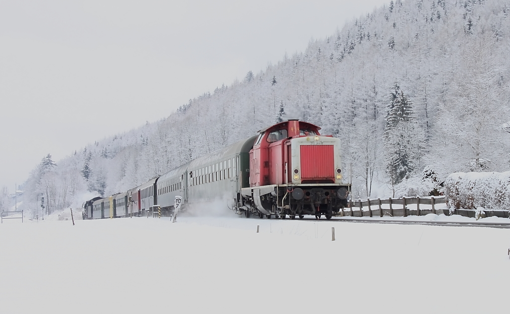 Mit dem Nebelhorn-Express von München über Buchloe und Immenstadt nach Oberstdorf im Allgäu. Gezogen wurde dieser Zug auf der Strecke München-Immenstadt von 41 1150. Als Schublok kam 212 284 zum Einsatz, zwischen Immenstadt und Oberstorf war die V100 dann Zuglok (so musste man nicht umsetzten), hier durchfährt der Sonderzug gerade Altstädten (Allgäu), ... (28.01.2012) mathias