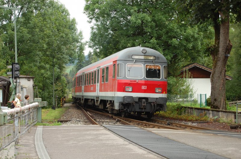 Während die 218 noch auf den Gegenzug wartet, fährt dieser schon ein. Es handelt sich um den 612 081, welcher am 10.8.2009 auf seiner Fahrt nach Oberstdorf in Fischen abgelichtet werden konnte. Pascal Ost