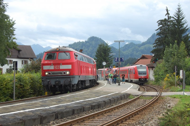 Während der Tf von 218 141-0 schon zum Abfahren bereit ist, steht 612 581 noch immer mit offenen Türen da. Aufgenommen am 10.8.2009 in Fischen. Pascal Ost
