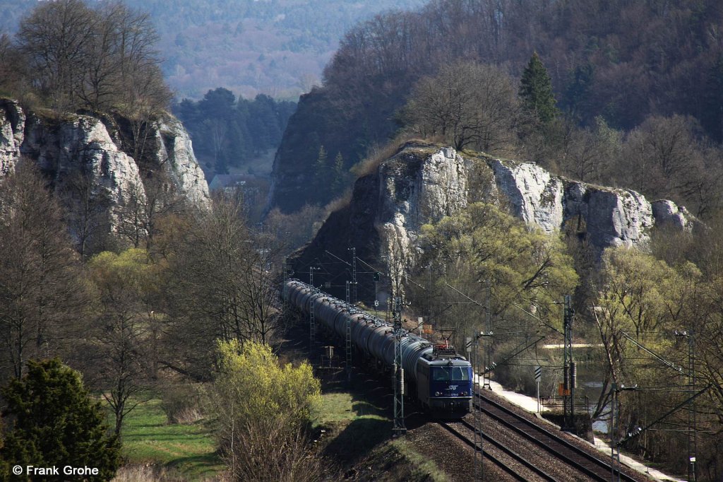 Mit einem fotogenen Kesselwagenzug war am 12. April 2025 die Railpool 186 430 bei Breitenfurt im Altmühltal in Richtung Treuchtlingen unterwegs. Für welches EVU die Lok zum Aufnahmezeitpunkt im Einsatz stand, ist mir leider unbekannt. Der letzte bekannte Mieter war die HSL. Da die Lok dort allerdings eine Werbung trug, gehe ich davon aus, dass sie inzwischen anderweitig vermietet wurde. Christoph Schneider