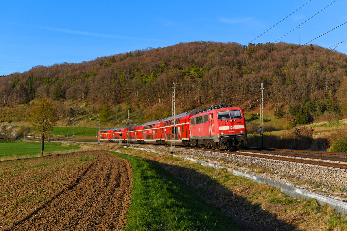 Am 12. April 2025 wurde die RB 59104 von München HBF nach Nürnberg HBF anstatt des planmäßigen Twindexx-Triebzuges mit einer Ersatzgarnitur gefahren. Im warmen Abendlicht kam die äußerlich recht abgekämpft wirkende 111 132 dennoch gut zur Geltung, als sie sich mit ihren fünf Doppelstockwagen bei Breitenfurt im Altmühltal in die Kurve legte. Für eine Lok der Baureihe 111 war besagte Maschine in ungewöhnlich vielen Betriebswerken beheimatet. 1980 startete ihre Karriere bei der S-Bahn in Düsseldorf. Danach gab es einen längeren Aufenthalt in Dortmund, so dass 111 132 mehr als 20 Jahre in Nordrhein-Westfalen verbrachte. Nächste Station war weiter nördlich in Braunschweig, wo sie 15 Jahre Regionalzüge in Norddeutschland beförderte. Ab 2015 ging es nach Baden-Württemberg. Hierbei wurde mehrfach zwischen die Betriebshöfen Ulm und Stuttgart gewechselt. Ihre vermutlich letzte Heimat hat 111 132 im Jahre 2024 in München gefunden, dem klassischen BW für die Baureihe. In den 45 Dienstjahren hat die Lok drei Farbschemata getragen - kieselgrau / orange, orientrot und verkehrsrot. Ein bewegter Lebenslauf also, mögen der Lok noch etliche problemlose Kilometer im Dienste von DB Regio vergönnt sein. Christoph Schneider