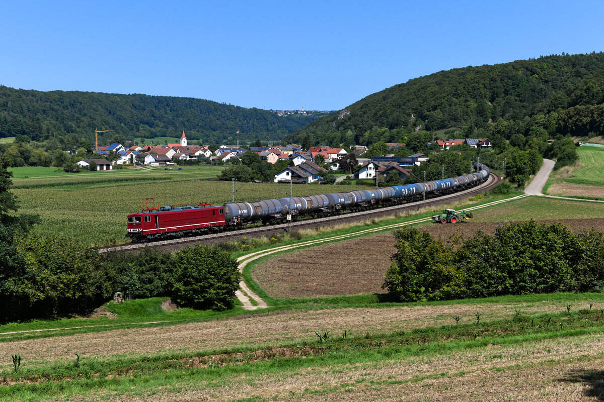 Die mustergültig in ihren Auslieferungszustand an die Deutsche Reichsbahn durch den VEB Lokomotivbau Elektrotechnische Werke „Hans Beimler“ Hennigsdorf im Jahre 1983 zurückversetzte 250 195 kam am 18. August 2023 bei Breitenfurt im Altmühltal perfekt im Licht liegend vorbei gefahren. Die für den Erfurter Bahn Service fahrende Lok brachte den Kesselwagenzug DGS 95723 von Ingolstadt nach Großkorbetha. Eigentümer des "Energie-Containers" ist das Fahrzeugwerk Karsdorf. Passend zur Durchfahrt des Zuges gesellte sich noch ein Traktor dazu. Christoph Schneider