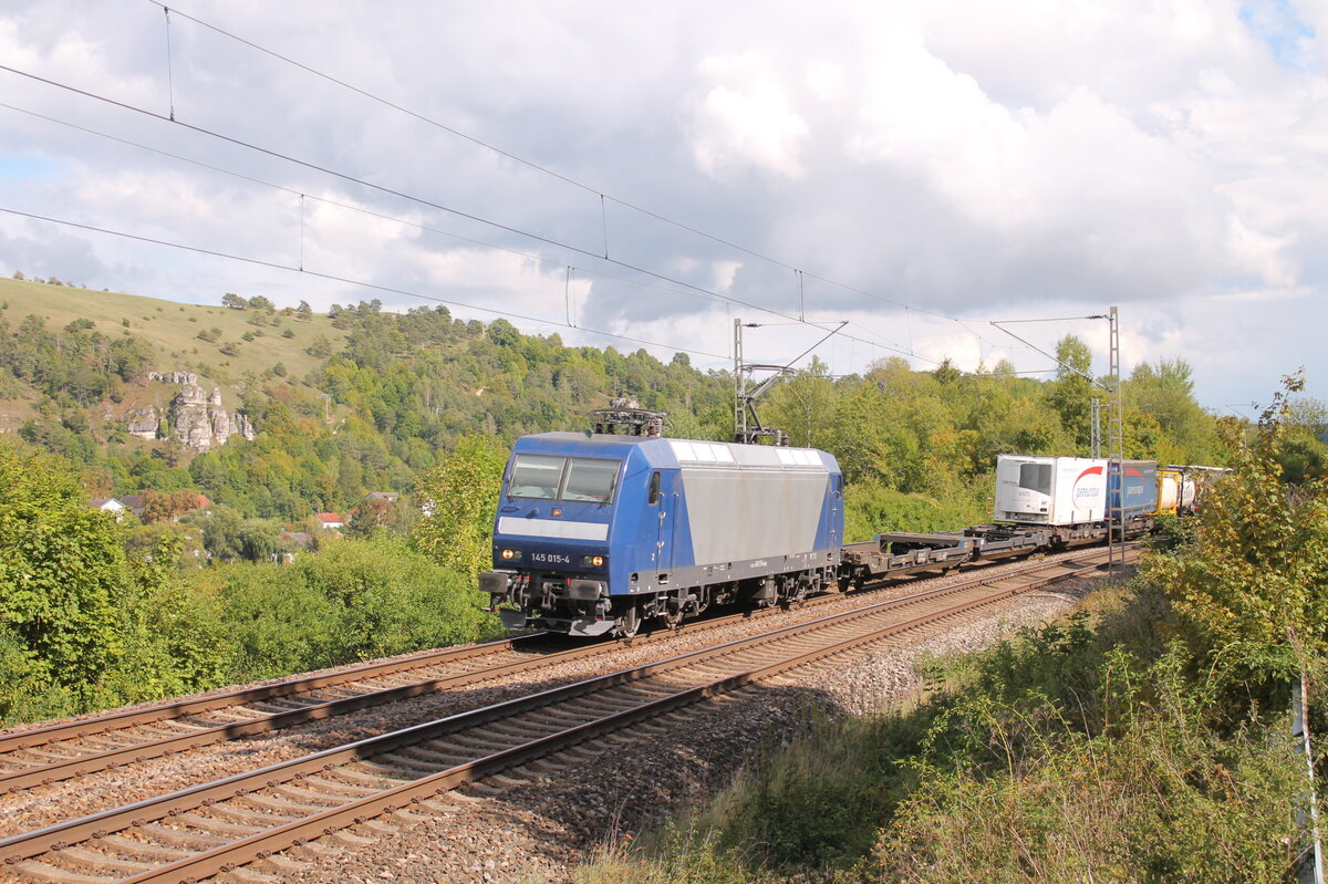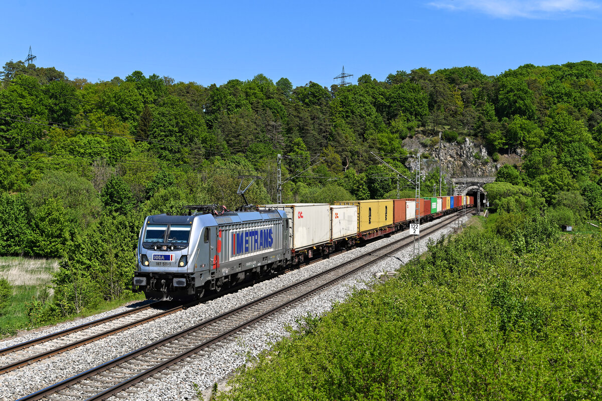 Am 14. Mai 2022 war der Containerzug DGS 88900 von München Riem Ubf nach Dradenau sehr gut ausgelastet. Gezogen wurde er von der bei Akiem angemieteten 187 511 der Metrans. Beim Verlassen des Esslinger Tunnels im Altmühltal konnte ich die Leistung dokumentieren. Christoph Schneider