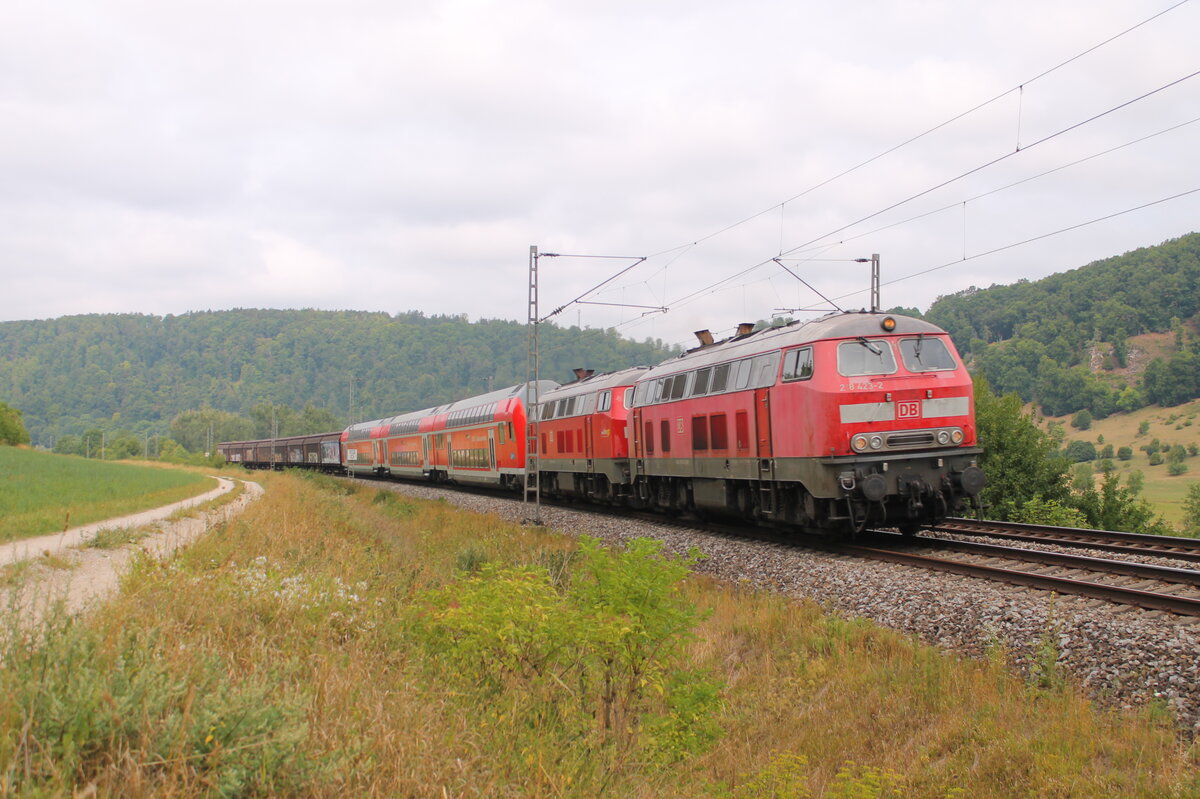 Am 06.08.2022 war der BR-Radltourzug auf der Rückfahrt von Gunzenhausen nach Mühldorf. Der Zug bestand aus 2 x 218 Doppelstockwagen und hinten die Güterwagen für die Fahrräder. Hier im Altmühltal bei Obereichstätt. Daniel Bauch