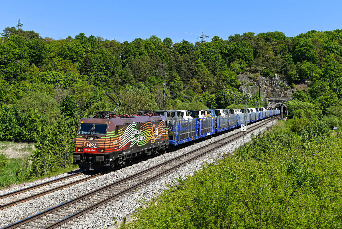 Am 14. Mai 2022 wurden aufgrund von Bauarbeiten zwischen Regensburg und Nürnberg einige Züge über das Altmühltal umgeleitet. Besonders fotogen war hierbei der von der HSL 185 602 beförderte Autotransportzug von Graz nach Bremerhaven. Ladegut waren Mercedes G-Klassen für den Export nach Übersee. Am Esslinger Tunnel wurde die Leistung von mehreren Fotografen erwartet. Christoph Schneider