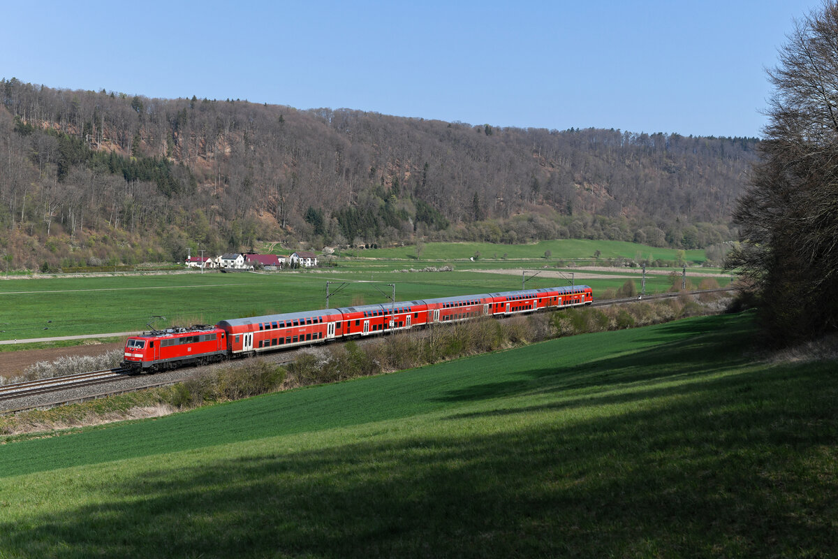 Am 22. April 2022 wurde die RB 59147 von Treuchtlingen nach München HBF ersatzweise mit 111 115 und Doppelstockwagen gefahren. Inzwischen ist dieser Einsatz bis Fahrplanwechsel an Werktagen sogar planmäßig. Hintergrund ist der knappe Bestand an Triebwagen der Baureihe 445, da an diesen technische Nachrüstungen erfolgen. Bei Breitenfurt fotografierte ich den geschobenen Wendezug. Leider wächst diese Stelle immer mehr zu. Christoph Schneider