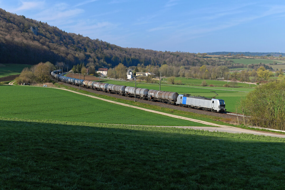 Am 22. April 2022 zeigten sich erste zarte Spuren des Frühlings im Altmühltal. Bei Breitenfurt legte sich die für Ecco Rail fahrende 193 827 mit einem Kesselwagenzug nach Ingolstadt in die Kurve. Christoph Schneider