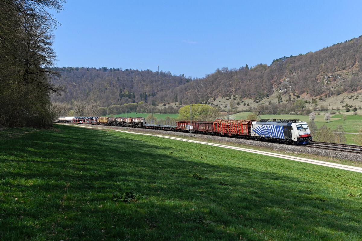 An Freitagen gab es einige Zeit lang eine interessante Leistung im Altmühltal zu beobachten. Am späteren Vormittag brachte Lokomotion einen gemischter Güterzug von Nürnberg Rangierbahnhof nach München Nord. Zum Einsatz kam hier jede gerade verfügbare E-Lok des Unternehmens, mit Ausnahme der Baureihe 139. Mit regelmäßig über 2.000 Tonnen Zuggewicht wäre die Leistung für die Einheits-E-Lok zu schwer gewesen. Ich benötigte allerdings mehrere Anläufe, den Zug wie gewünscht zu dokumentieren. Zu oft war eine schwarze MRCE-Lok für diesen Dienst eingeteilt. Am 22. April 2022 hatte ich dann halbwegs Glück und ich konnte den DGS 59859 nach München Nord bei Obereichstätt zumindest mit einem Zebra bespannt fotografieren. Der fotogen gebildete Zug des Einzelwagenverkehrs wurde von der 186 440 zu seinem Zielbahnhof befördert. Christoph Schneider