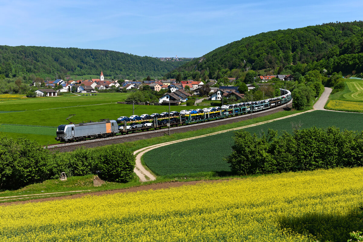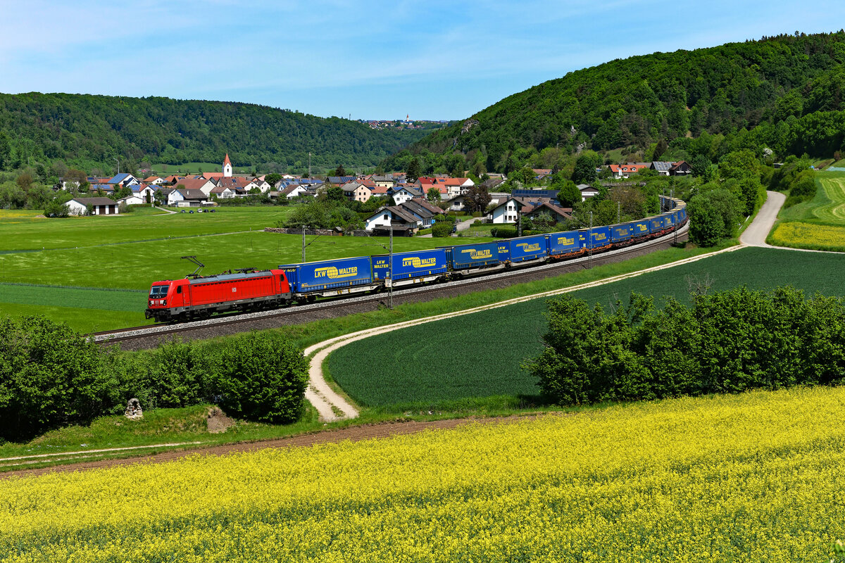 Aus meiner Sicht ungewöhnlich war am 15. Mai 2022 die Bespannung des KT 42154 von Verona Q. E. nach Rostock Seehafen in Form der 187 173. Eine Lok dieser Baureihe hatte ich bisher noch nie vor einem von DB Cargo geführten KLV-Zug beobachtet. Bei Breitenfurt im Altmühltal bildete ein blühendes Rapsfeld den passenden Rahmen für eine Aufnahme. Christoph Schneider