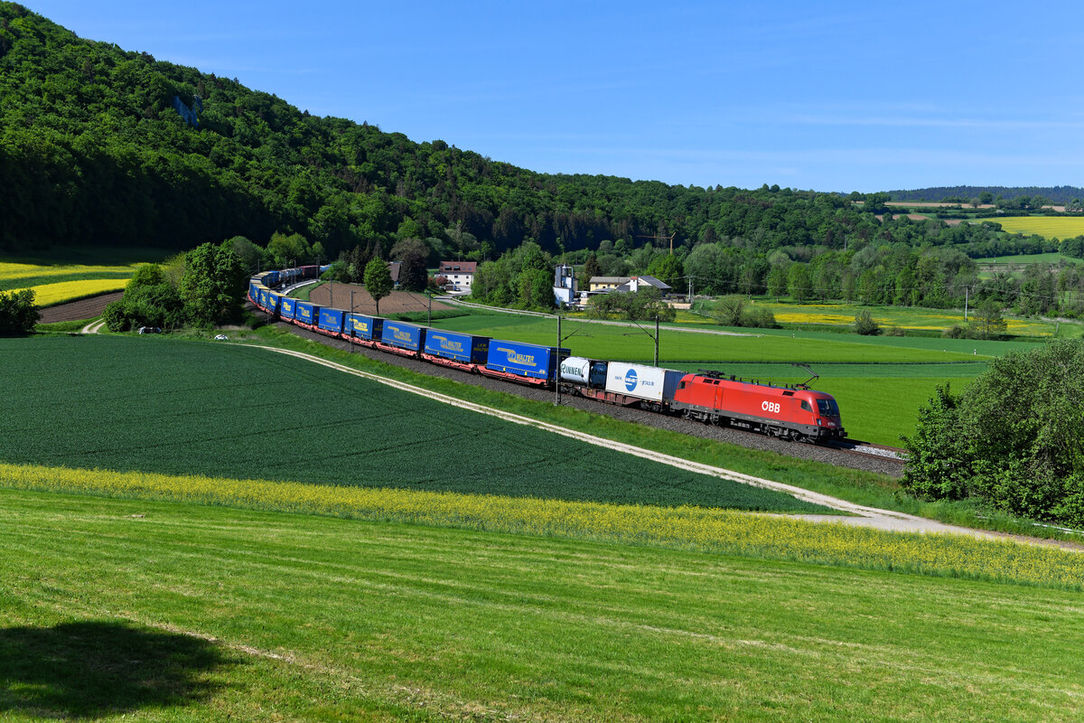 Frühling im Altmühltal. Am 15. Mai 2022 bespannte die ÖBB 1116.190 den KLV-Zug DGS 41823 von Rheinhausen nach Ljubljana Moste. Bei Breitenfurt setzte die komplett beladene Leistung den gewünschten farblichen Akzent in der blühenden Landschaft. Christoph Schneider