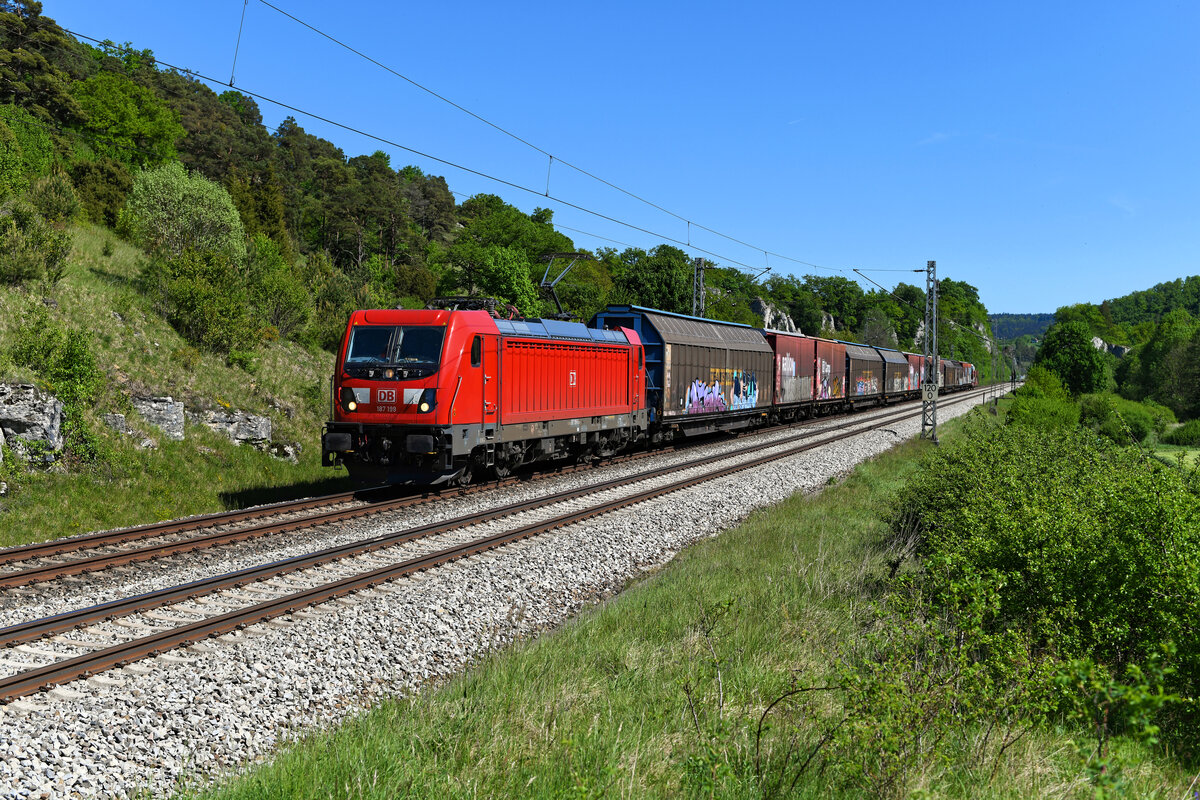 Mit dem nachmittäglichen Autoteilezug, der zwischen den Werken Ingolstadt und Heilbronn des Herstellers Audi verkehrt, konnte ich am 14. Mai 2022 die noch nicht mal ein Jahr für DB Cargo im Einsatz stehende 187 199 bei Hagenacker im Altmühltal fotografieren. Christoph Schneider