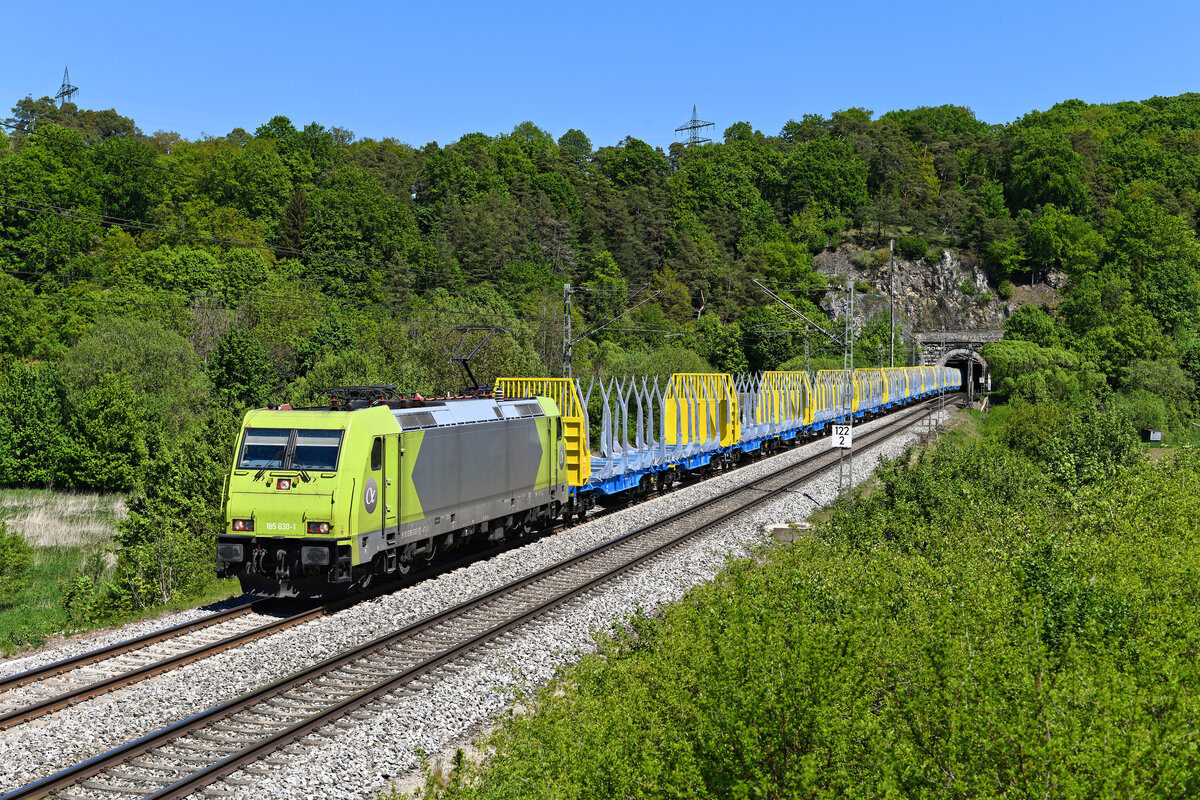 Mit einem Ganzzug, bestehend aus nagelneuen 90ft InnoWaggons für Rundholztransporte, war die für die HLG fahrende 185 630 von Alpha Trains in Richtung Westen unterwegs, als ich sie beim Verlassen des Esslinger Tunnels im Altmühltal fotografieren konnte. Das Bild entstand am 14. Mai 2022, als einige Güterzüge baustellenbedingt den Weg über Ingolstadt und Treuchtlingen nahmen. Christoph Schneider