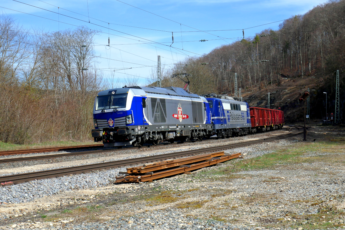 Vectron Dual-Mode 90 80 2248 002 D-RPRS von Railsystems RP legt sich zusammen mit der 151 079 des selben Betreibers in Solnhofen in die Kurve, unterwegs Richtung Treuchtlingen.