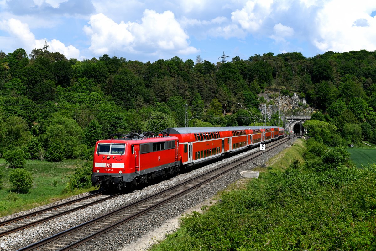 Am 12. Mai 2018 konnte ich 111 031 mit ihrer RB 59098 nach Nürnberg HBF am Esslinger Tunnel im Altmühltal aufnehmen. Alle abgebildeten Fahrzeuge haben keine große Zukunft mehr vor sich. Mit Ablieferung der neuen Twindexx-Triebzüge verlieren die Münchner und Nürnberger 111-er praktisch alle Leistungen. Und auch die Doppelstockwagen aus der Serie 1993 werden baldmöglichst abgestellt, ebenso der "Wittenberger"-Steuerwagen. Christoph Schneider