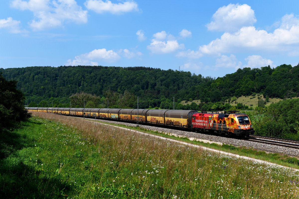 Am 12. Mai 2018 nahm 1016.048 zwischen Nürnberg und Zielbahnhof Dingolfing den recht ungewöhnlichen Laufweg über Ingolstadt und München Nord. Die klassisch mit dem Namen Florian versehene Maschine wirbt für den niederösterreichischen Feuerwehrverband. Bei Obereichstätt im Altmühltal konnte ich die gelungen gestaltete Werbelok mit ihrer langen Schlange gelber ARS-Wagen aufnehmen. Christoph Schneider