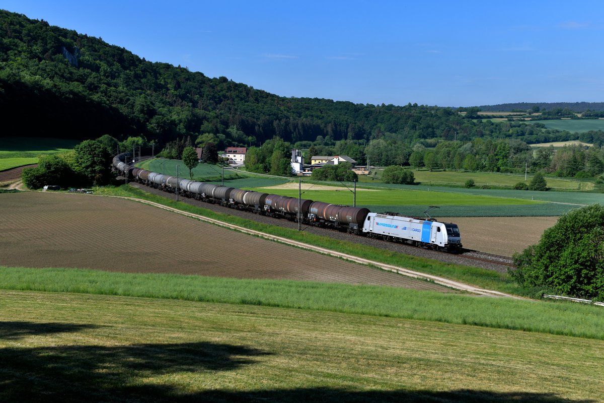 Am Morgen des 13. Mai 2018 konnte die an die Rurtalbahn vermietete Railpool 185 672 mit einem Kesselwagenzug bei Breitenfurt im Altmühltal beobachtet werden. Christoph Schneider