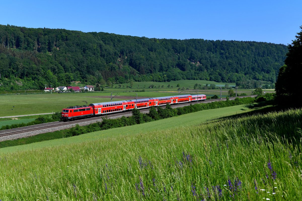 Auch am 13. Mai 2018 konnten noch zahlreiche Leistungen mit Loks der Baureihe 111 im Altmühltal beobachtet werden. Inzwischen ist der Nahverkehr zwischen Ingolstadt und Treuchtlingen fest in der Hand der neuen Twindexx-Triebwagen. Bei Breitenfurt konnte ich an diesem Tage 111 226 mit ihrer RB 59148 aufnehmen. Christoph Schneider