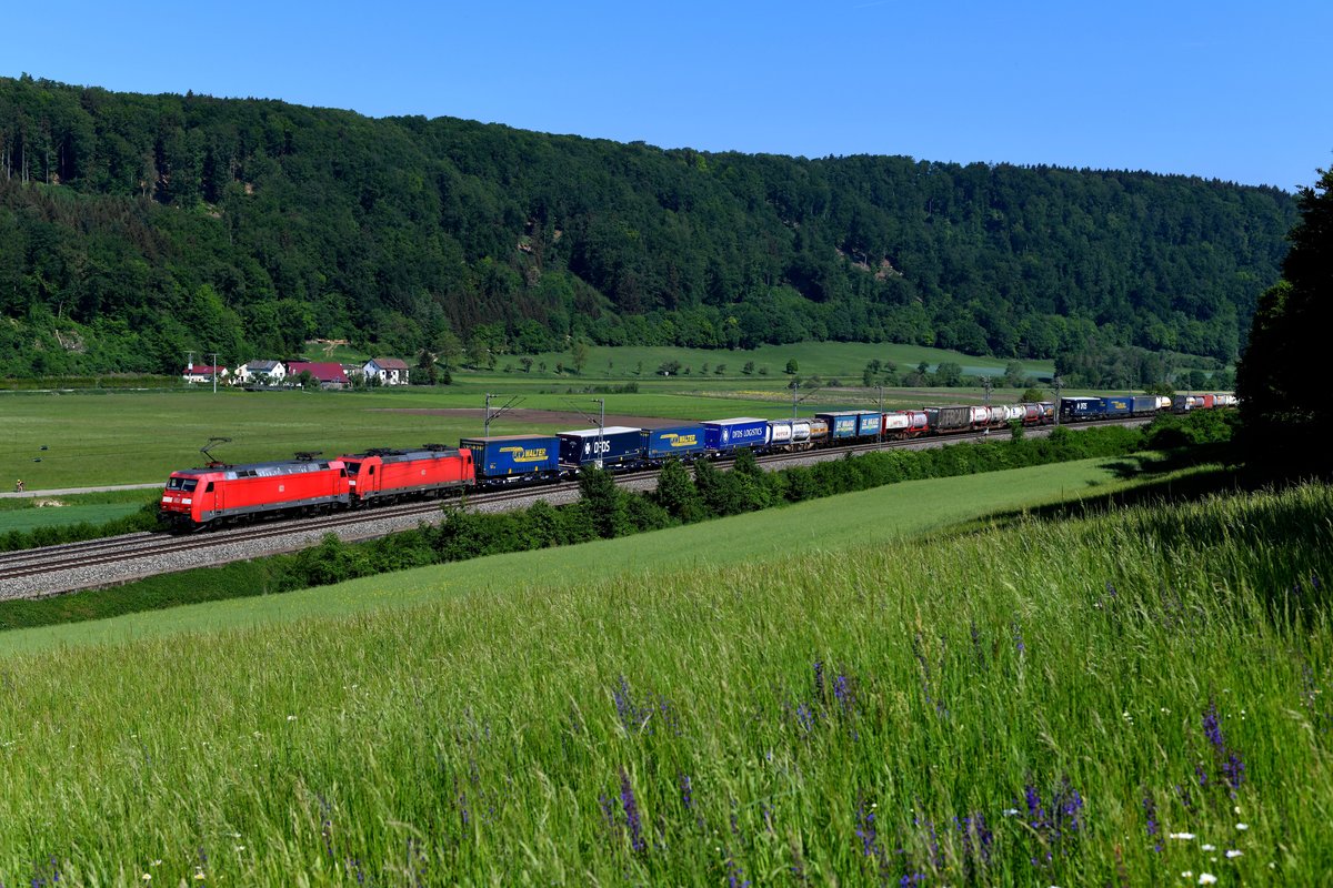 Der KTE 42542 von Verona Q. E. nach Geleen-Lutterade wurde am 13. Mai 2018 von 152 020 befördert, 185 344 lief als Wagenlok mit. Den gut ausgelasteten Zug des kombinierten Ladungsverkehres konnte ich bei Breitenfurt im Altmühltal fotografieren. Christoph Schneider