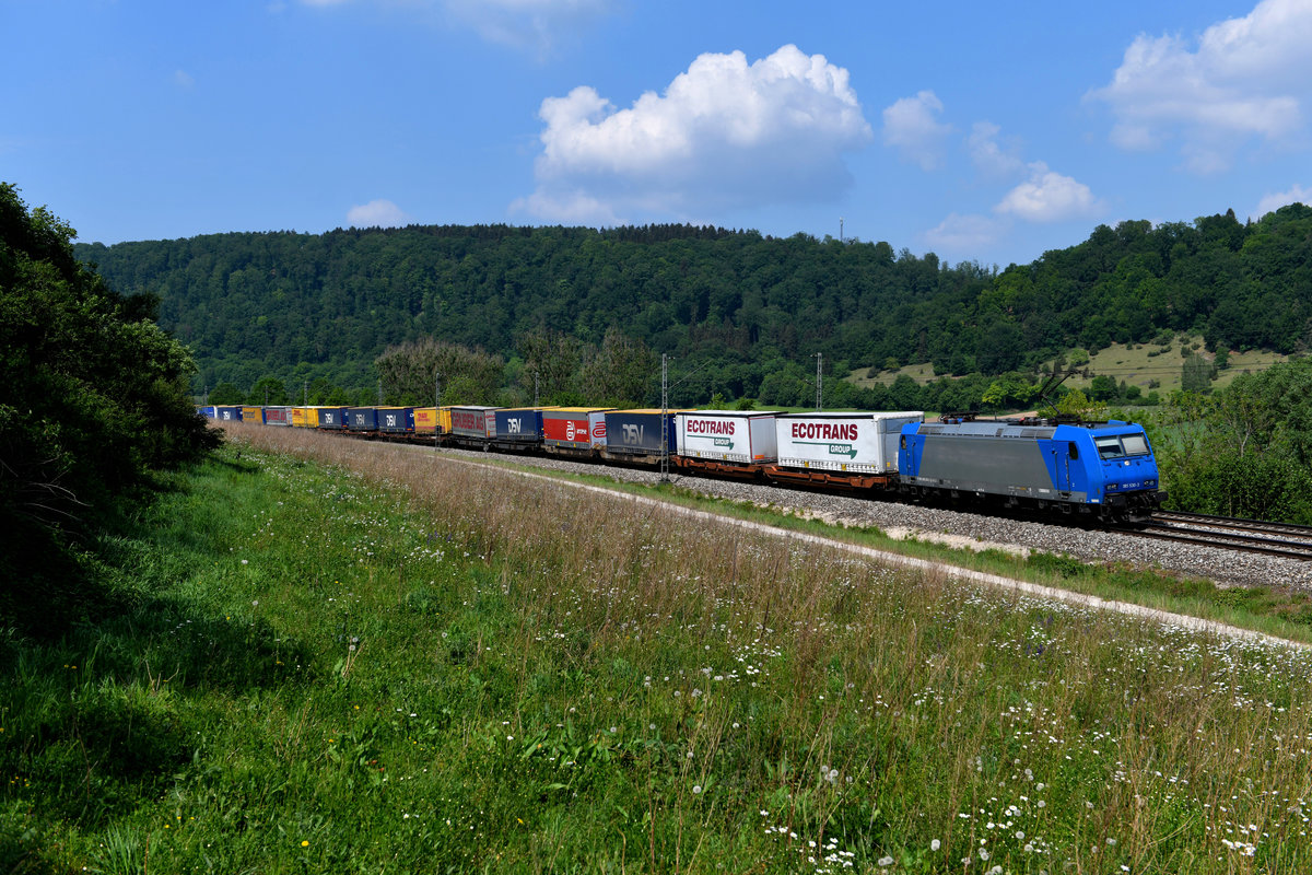 Die an TXL vermietete 185 530 von Alpha Trains beförderte am 12. Mai 2018 den komplett beladenen DGS 43143 von Lübeck Skandinavienkai nach Verona Q. E. und konnte bei Obereichstätt im Altmühltal dokumentiert werden. Die Lok wird den Zug noch bis München Laim Rbf bringen. Dort wird der Zug dann zumeist mit einem Vectron-Tandem für die Fahrt über den Brenner-Pass bespannt. Christoph Schneider