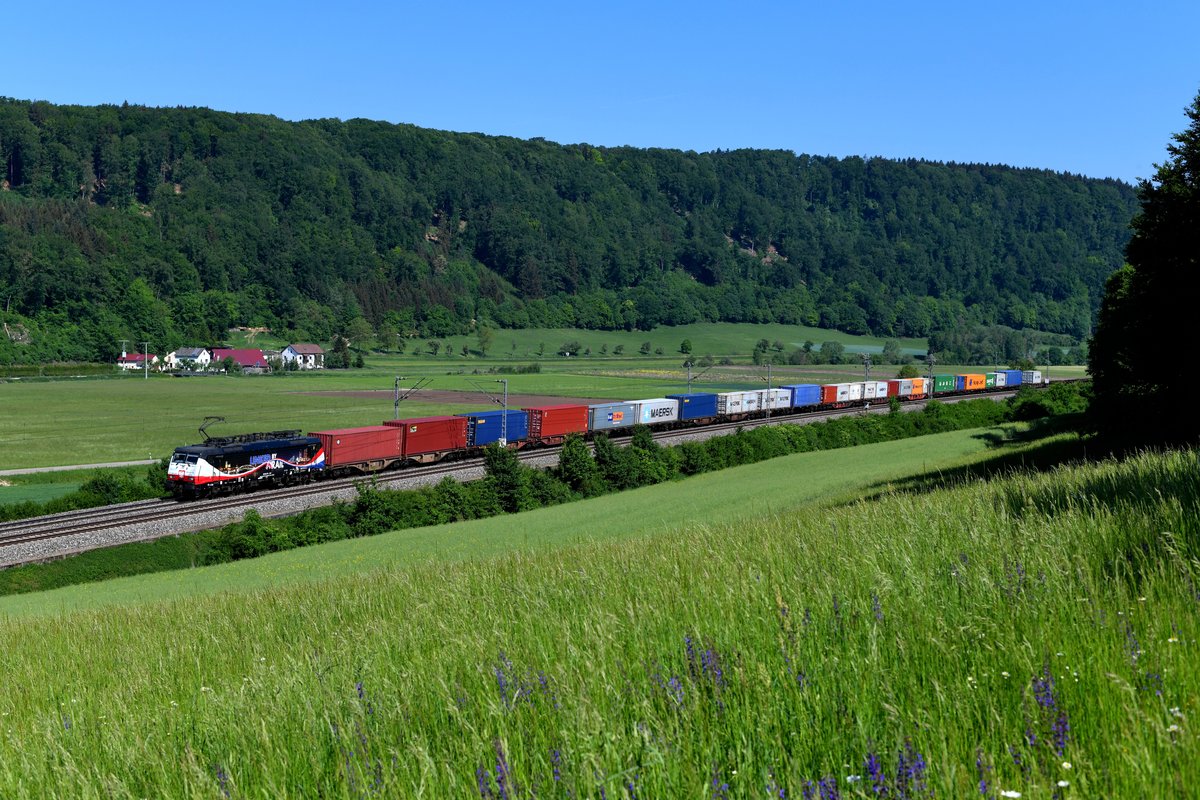 Seit einigen Monaten besteht eine Containerzug-Verbindung zwischen Wolfurt in Vorarlberg und Holland. Der Zug wird in Österreich von den ÖBB traktioniert, ab Kufstein übernimmt eine Lok der LTE. Im Frühjahr 2018 kam hierbei häufiger die schön gestaltete 189 212 zum Einsatz. Am 13. Mai 2018 ergab sich die glückliche Fügung, dass die für den Rotterdam-Posen-Shuttle werbende Lok am Vormittag den Weg durch das Altmühltal nahm. Bei Breitenfurt konnte ich den farbenfrohen Containerzug aufnehmen, der darüber hinaus fotografenfreundlich beladen war - die leeren Wagen befanden sich ausnahmsweise mal am Zugschluss. Christoph Schneider