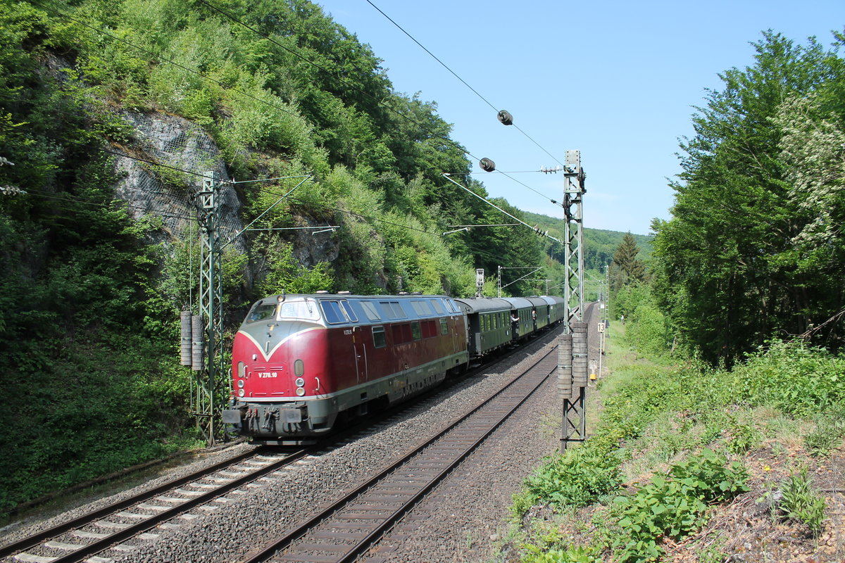 Am 10.05.2018 war die 270.10 ehem. 221 124 mit einem Sonderzug von Veitshöchheim nach Saal an der Donau unterwegs. Hier befindet sie sich kurz vor der Einfahrt von Eichstätt Bahnhof im schönen Altmühltal.