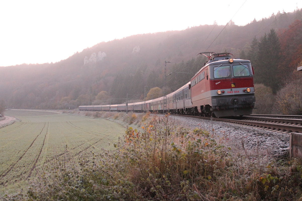 Am 31.Oktober 2017 fuhren 700 Eishockeyfans des ERC Ingolstadt mit einem Sonderzug zum Auswärtsspiel nach Köln. Gezogen wurde der Zug von 1142 654 der SVG. Hier zu sehen im noch morgendlichen Nebel bei Breitenfurt.