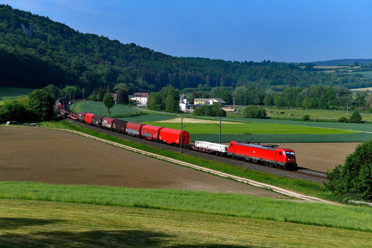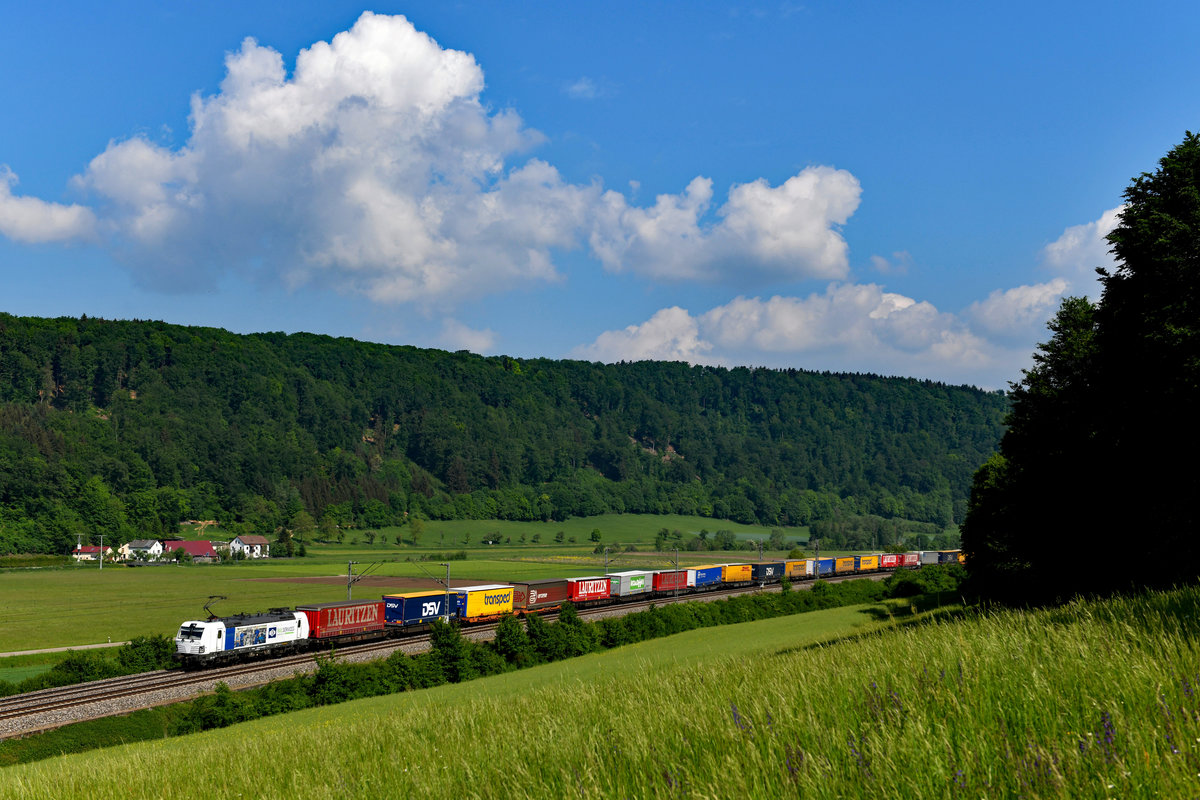 Der Railpool Vectron 193 813 mit seiner Seitenwerbung für Knorr-Bremse ist aktuell an TXLogistik vermietet. Am 12. Mai 2018 konnte ich diese Lok vor dem farbenfroh beladenen DGS 95240 nach Lübeck Skandinavienkai bei Breitenfurt im Altmühltal ablichten. Erfreulicherweise war die Lok wohl kurz vorher in der Waschanlage, allerdings stellte diese Tatsache gewisse Herausforderungen an Belichtung und Bildbearbeitung.