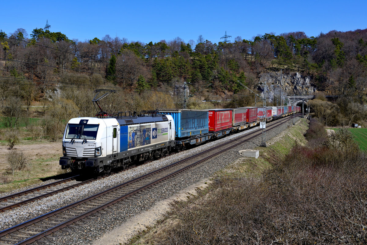 Der Railpool Vectron 193 813 mit seiner Seitenwerbung für Knorr-Bremse ist aktuell an TXLogistik vermietet. Am 07. April 2018 konnte ich diese Lok vor dem DGS 43108 nach Hannover Linden im frühlingshaften Altmühltal bei der Ausfahrt aus dem Esslinger Tunnel ablichten.