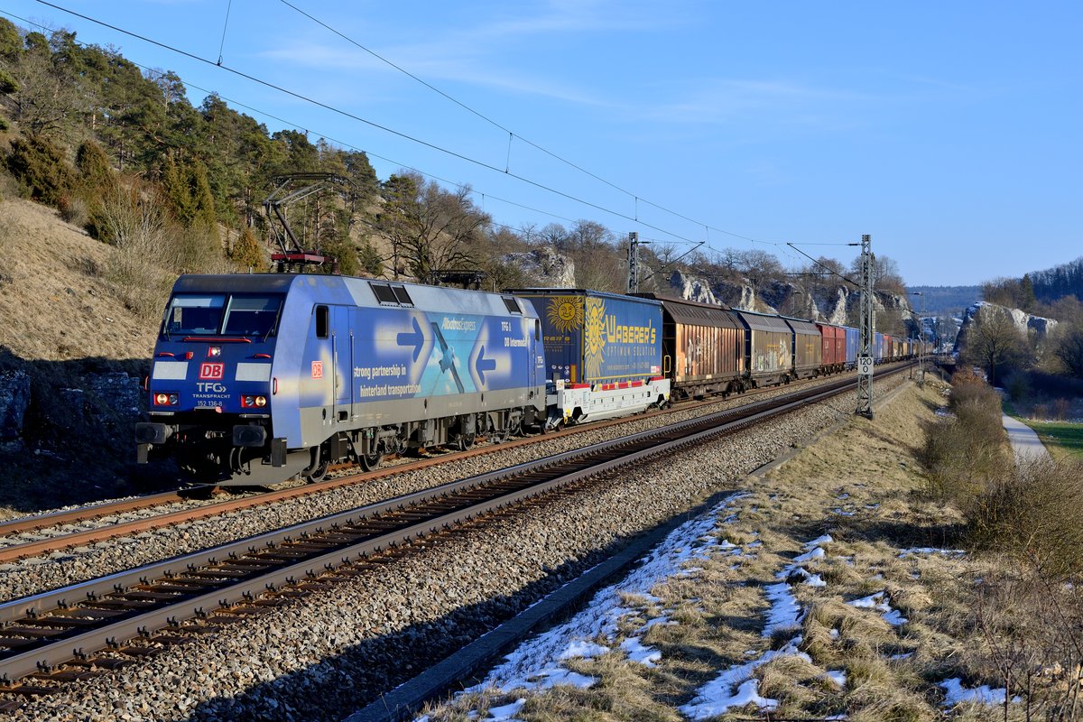 Die Hoffnung auf eine geschlossene Schneedecke im Altmühltal wurde am 24. Februar 2018 leider nicht erfüllt. Aber wenige Momente bevor die Sonne hinter den Bäumen verschwand, kam der GA 52824 von Ingolstadt Nord nach Braunschweig bei Hagenacker durch die charakteristischen Felsformationen gerauscht. Die Bespannung war mit 152 136 auch attraktiv, die tief stehende Sonne ließ das Laufwerk der Güterzuglok plastisch hervortreten. Interessant auch der erste Wagen des Zuges, beladen mit einem Aufflieger der ungarischen Spedition Waberer's. Hierbei handelt es sich um einen CargoBeamer JetModule, Gattungsbezeichnung Sdkmss.