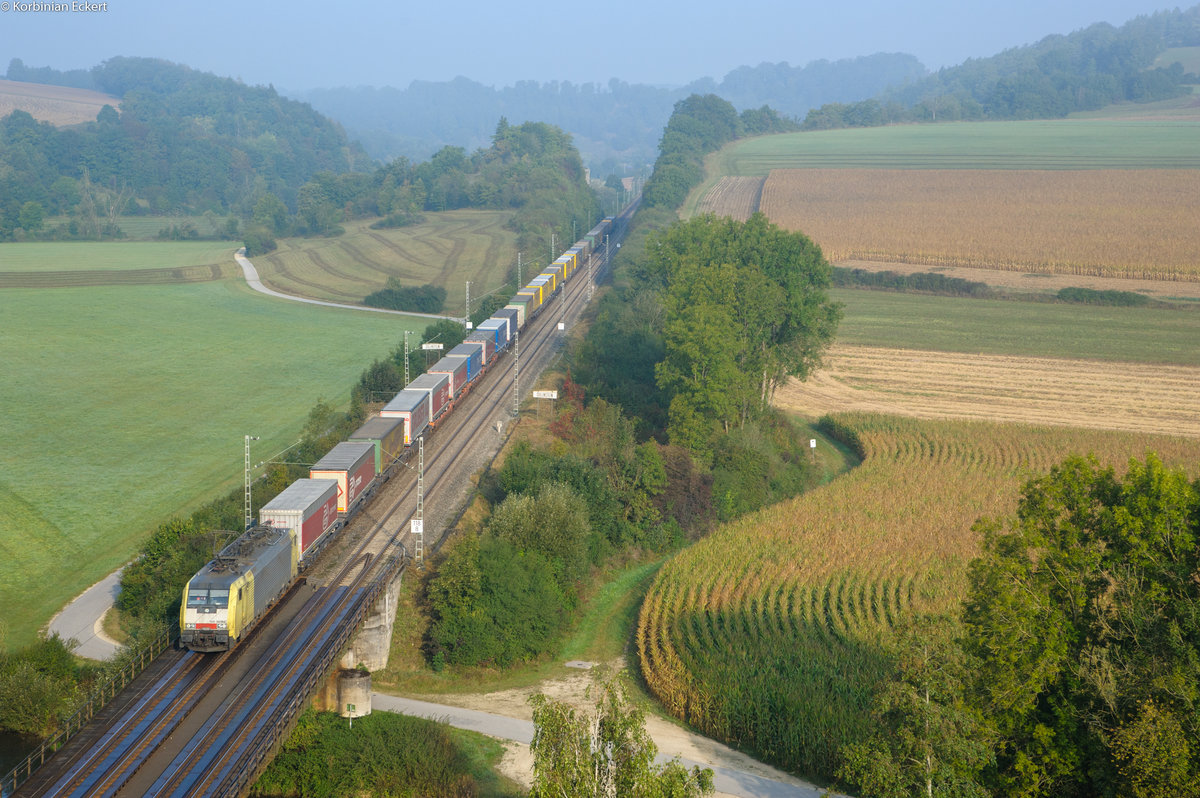 Immer mal wieder kommt Stasicontainer nach Ingolstadt. Hier 155 180 mit dem GA 52869 von Osnabrück Rbf nach Ingolstadt Nord. Am 25.08.16 zwischen Gaimersheim und Ingolstadt.