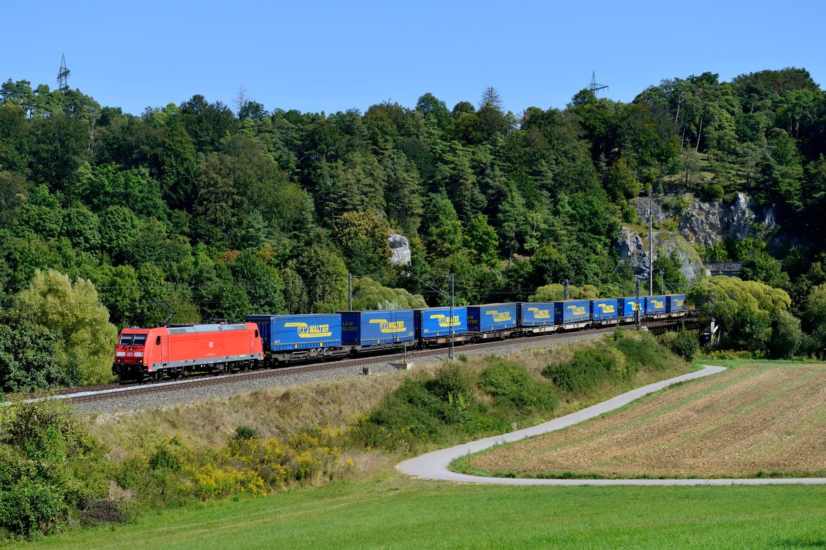 185 214 beförderte am 08. September 2016 den umgeleiteten KT 69212 durch das Altmühltal, hier aufgenommen bei Esslingen. der Zug war einheitlich mit aufliefern der Spedition LKW Walter beladen.