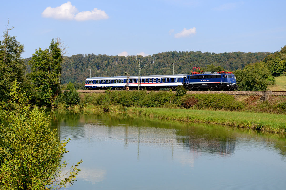 Am 10 September 2016 wurden zwei NX Reisezugwagen für den Meridian Ersatzverkehr von Dessau nach München überführt. Dabei kam die 110 469 zum Einsatz. Der unter der Bezeichnung DLr 01309 verkehrenden Leistung wurde bei Pappenheim aufgelauert. Die erhoffte Spiegelung machte ein springender Karpfen zunichte, der Busch fiel mir erst nachträglich auf - trotzdem bin ich froh, diese seltene Leistung dokumentiert zu haben, zumal ein Sonnenbild bei aufziehender Bewölkung Glückssache war.... Christoph Schneider