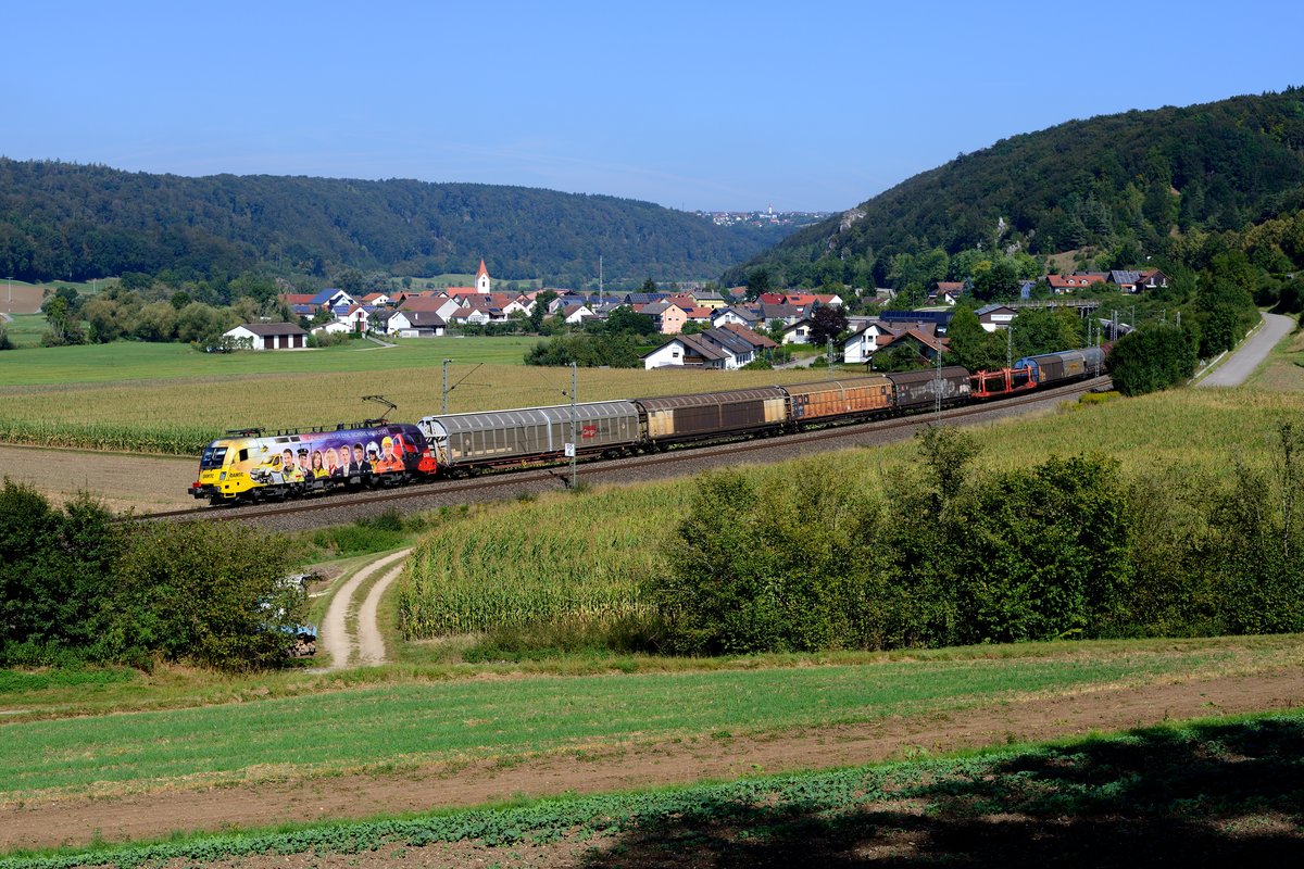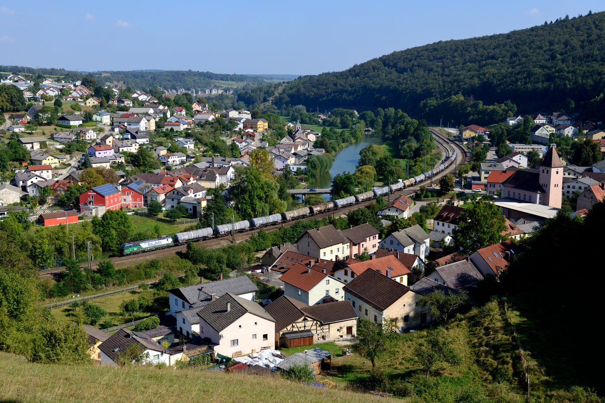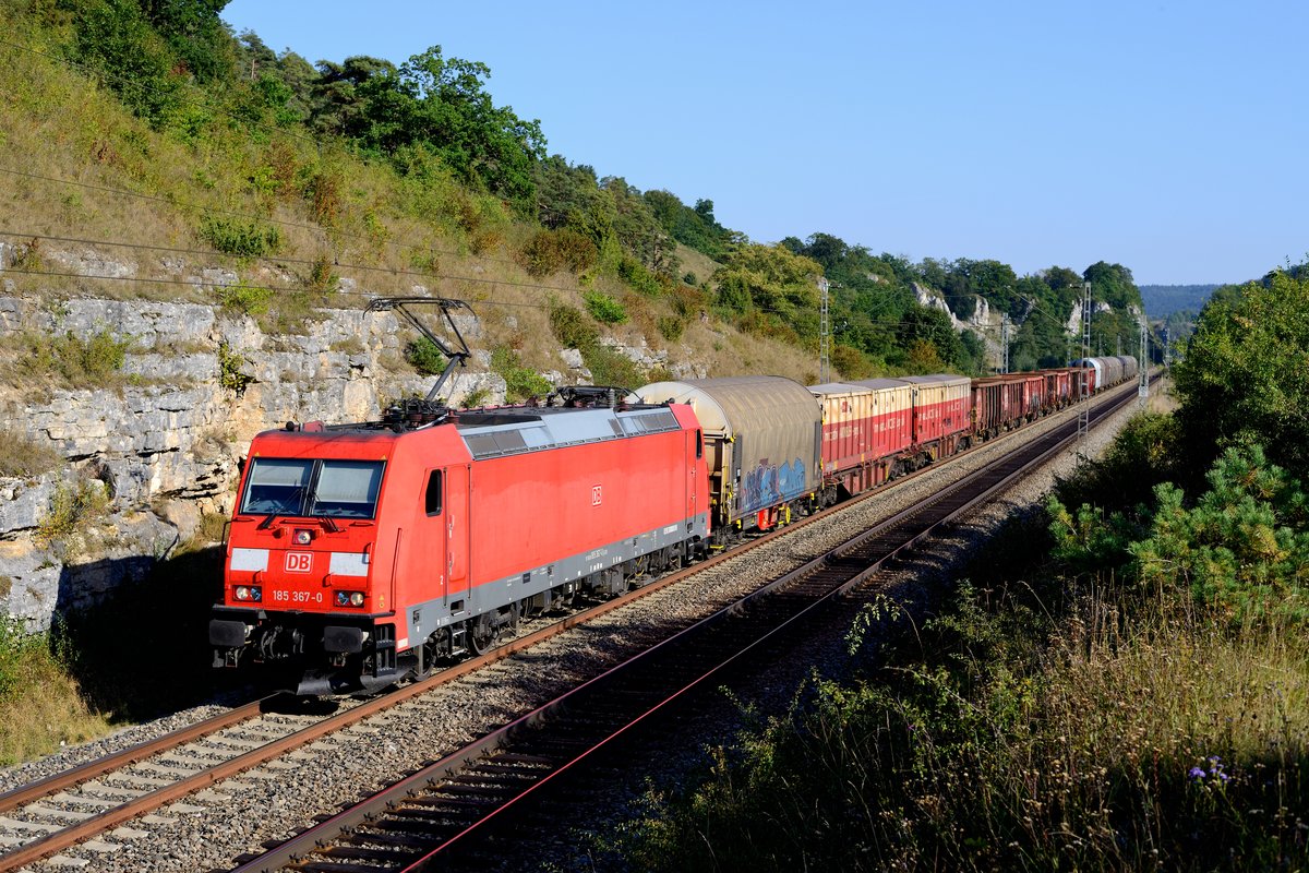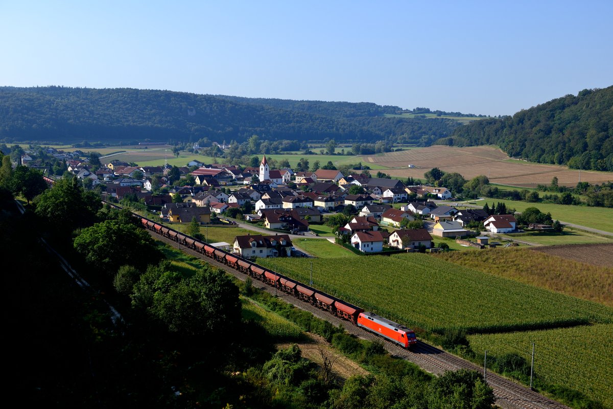 Am 10. September 2016 zog 185 170 den GA 47906 durch das beschauliche Altmühltal. Bei Breitenfurt gelang diese Aufnahme von einem erhöhten Standpunkt. Im Hintergrund kann man die Ortschaft Schernfeld erkennen. Christoph Schneider