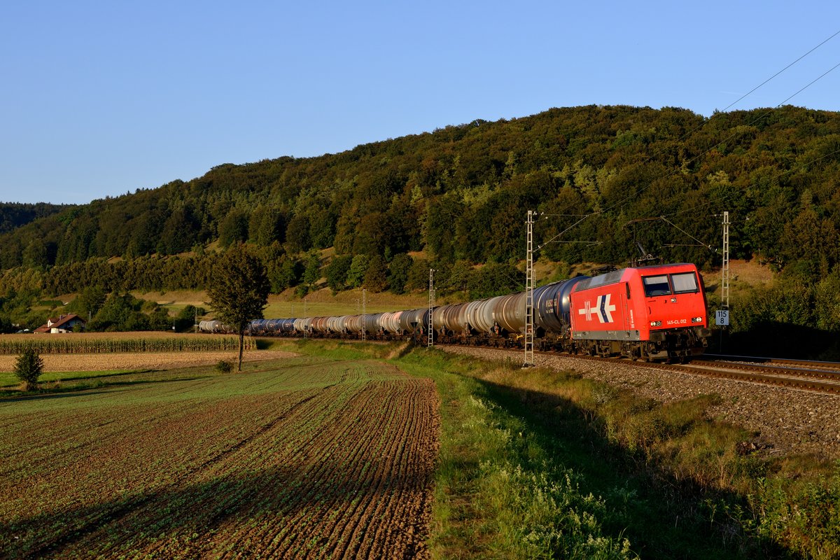 Bei Breitenfurt hält sich das Licht immer am längsten. Der von der noch in der HGK Farbgebung befindlichen 145-CL 012 gezogene Kesselwagenzug wäre an allen anderen Fotostellen im Altmühltal bereits im Dunkeln gewesen (12. September 2016). Christoph Schneider