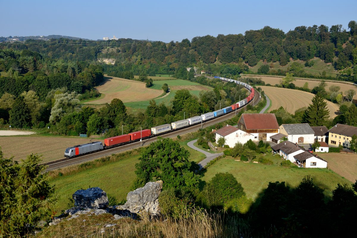 Der DGS 41853 von Ludwigshafen BASF UBF nach Triest Campo Marzio - besser bekannt als "Ekol-Zug" - kam am 10. September 2016 glücklicherweise genau in dem knapp bemessenen Zeitfenster durchs Altmühltal gefahren, an dem die Fotostelle mit dem Blick über Hagenacker und den Esslinger Tunnel gut im Licht liegt. Es führte die durch ihren roten Streifen gut identifizierbare Railpool 185 679. Christoph Schneider