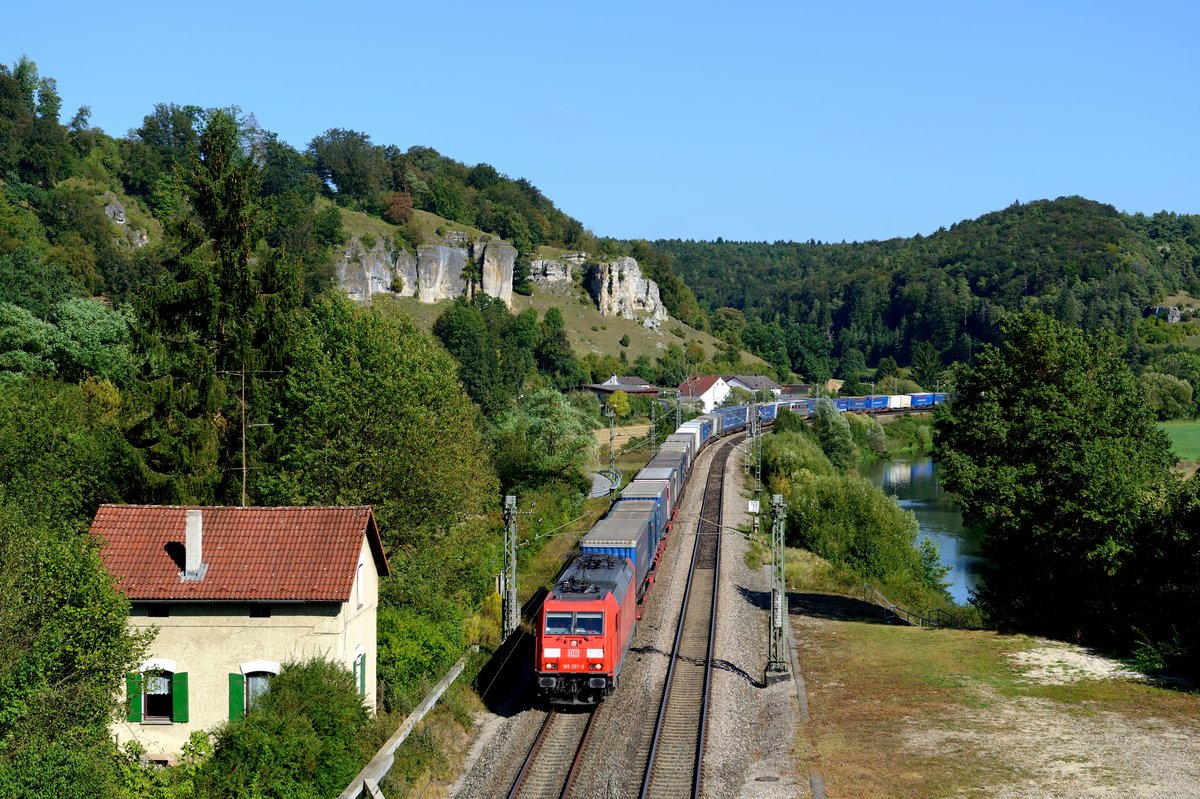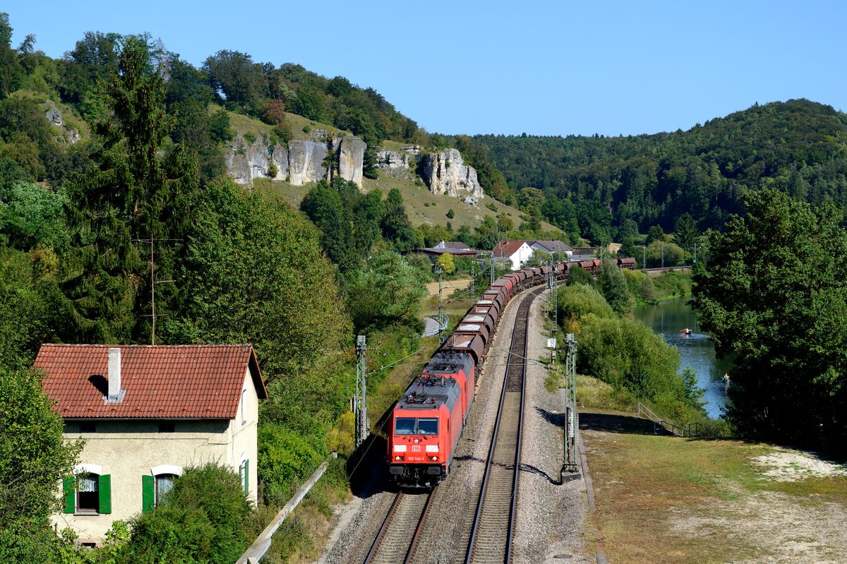 Vom Ostportal des Esslinger Tunnels ergibt sich folgender Blick auf Bahn und Landschaft. Das alte Bahnwärterhäuschen wird von den neuen Besitzern gut gepflegt, im Hintergrund eine für das Altmühltal typische Felsformation und auch das dem Tal den Namen gebende Flüsschen wird sichtbar, samt zweier Paddelboote. Die beschauliche Szenerie wurde nur kurz durch die Durchfahrt von 185 346 und einer Schwesterlok mit einem Schotterzug gestört (08. September 2016). Christoph Schneider