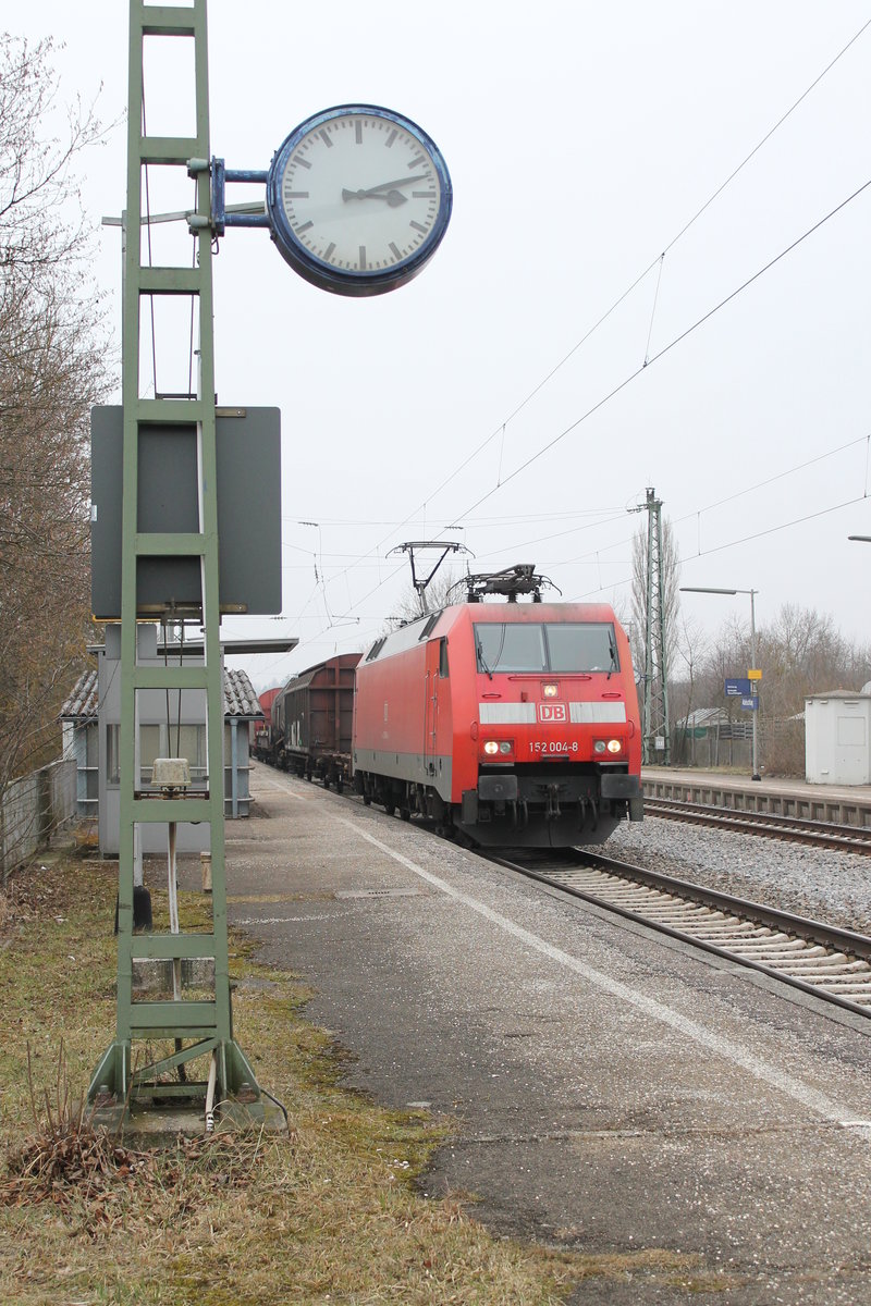 152 004 diese Lokomotive ist auch schon ziemlich lange in Geschäft, durchfährt am 10.02.2017 den Haltepunkt Adelschlag mit ihrem gemischten Güterzug in Richtung Ingolstadt. Daniel Bauch