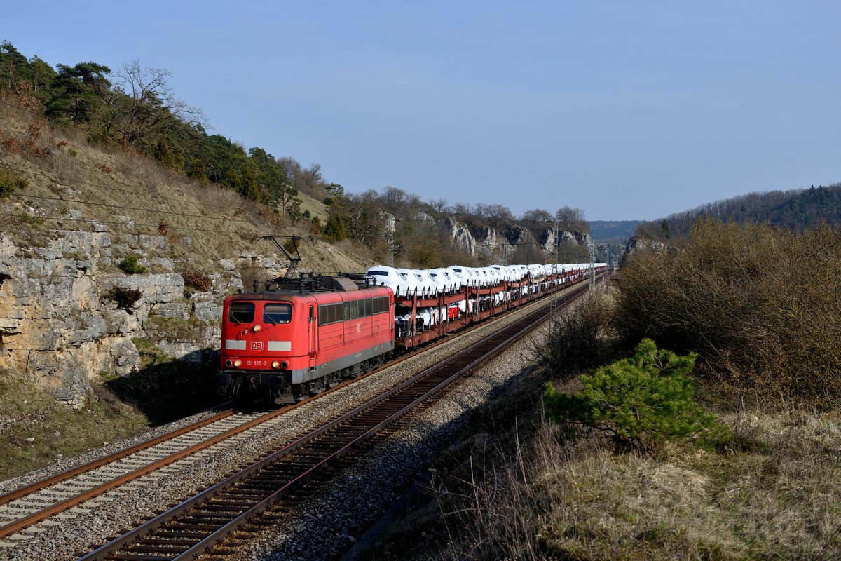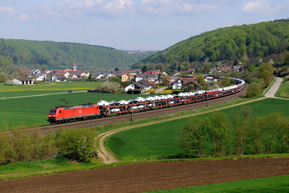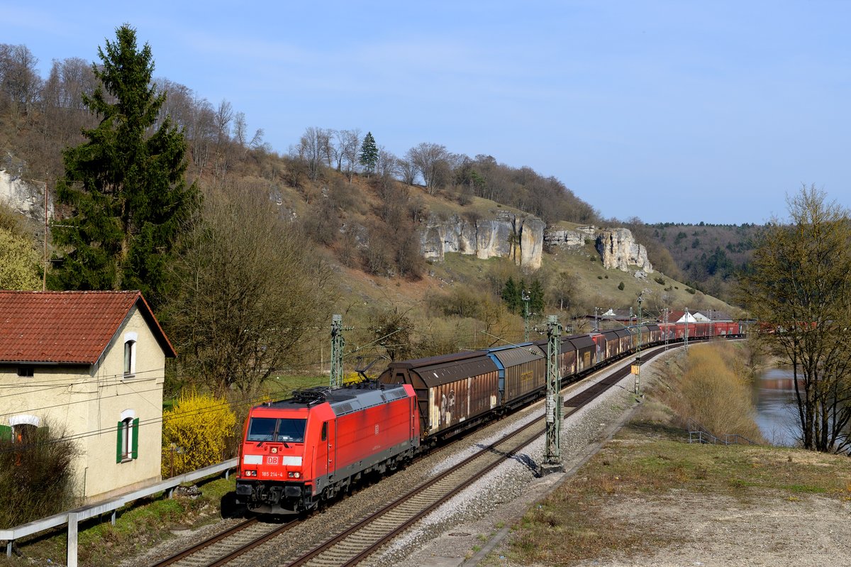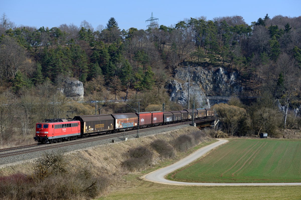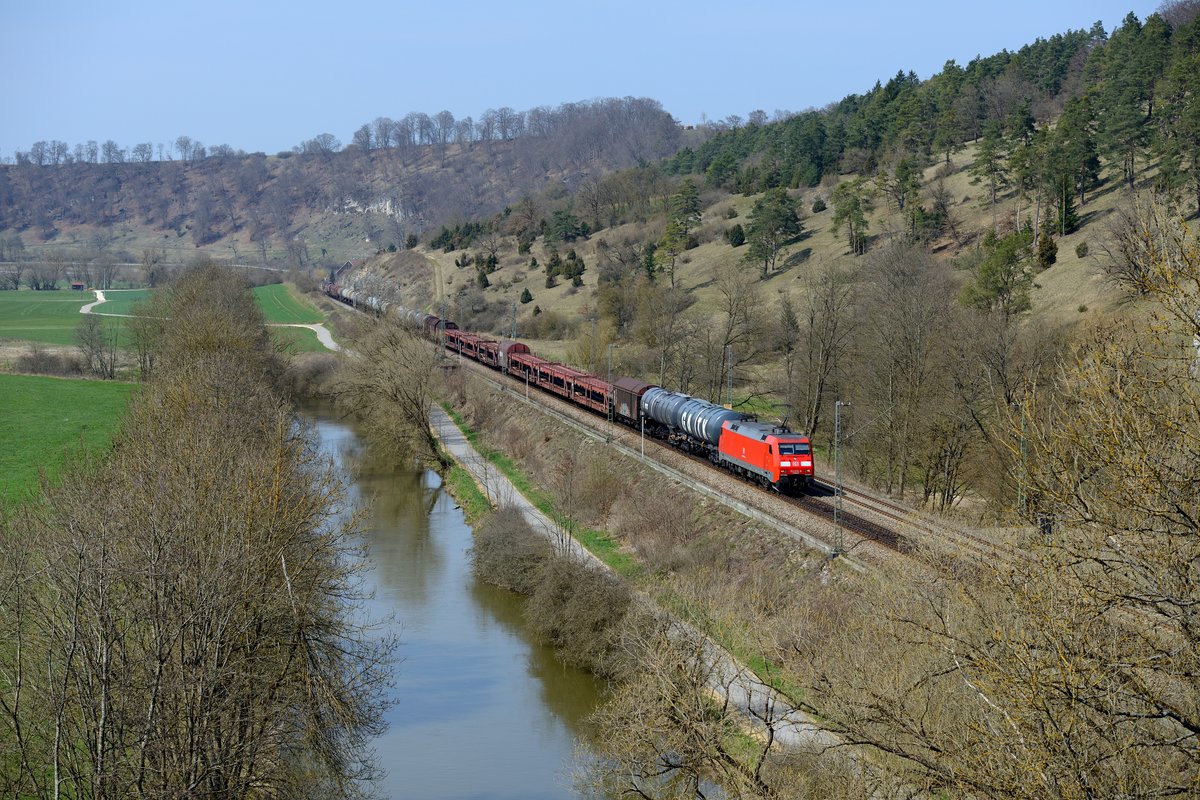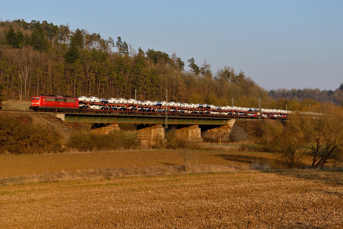 Die Schatten im Altmühltal wurden länger, deswegen wurde bei der Durchfahrt von GA 52824 von Ingolstadt Nord nach Braunschweig etwas mehr Brennweite gewählt. Der Zug befördert Autoteile für den Volkswagen Konzern, am 19. März 2015 war 185 269 Zuglok. Christoph Schneider