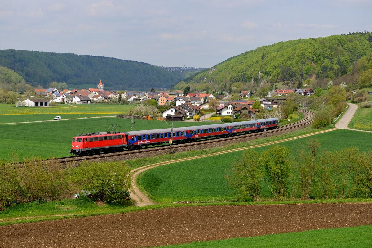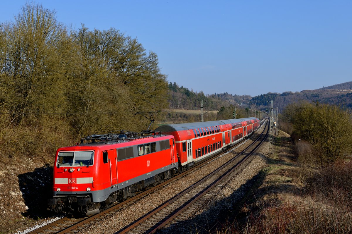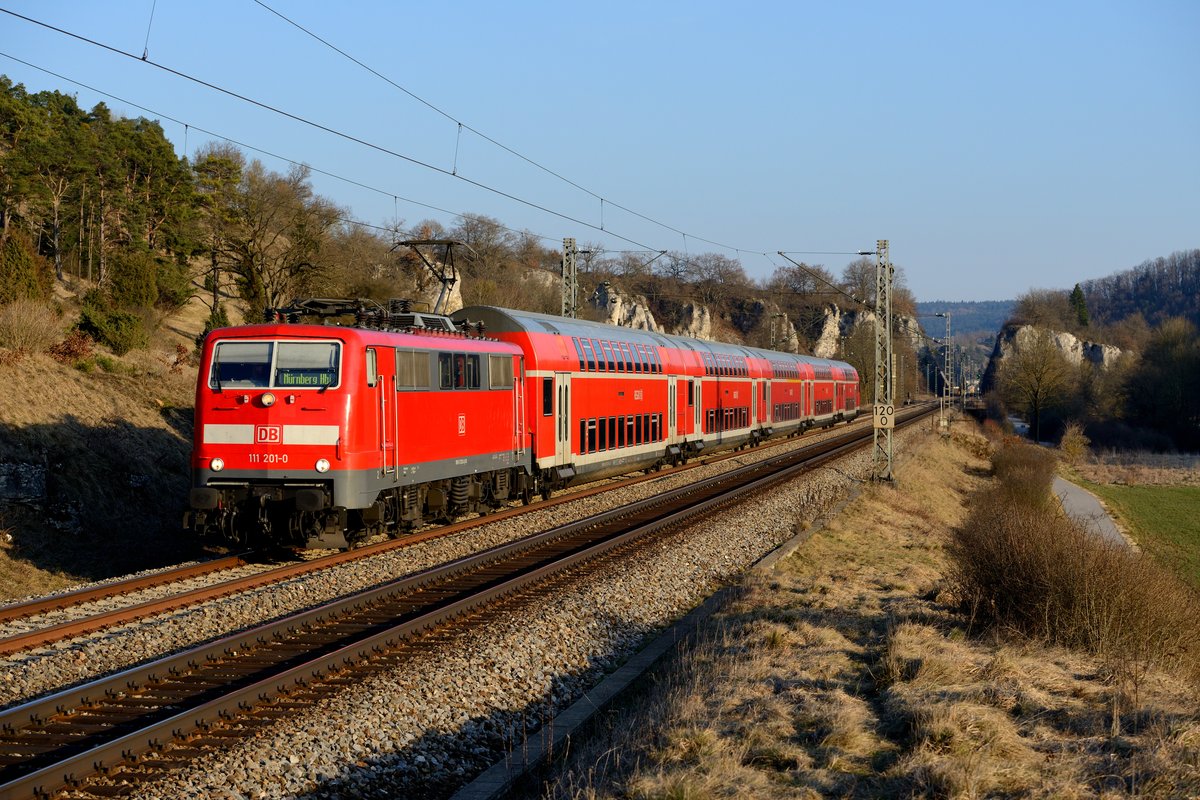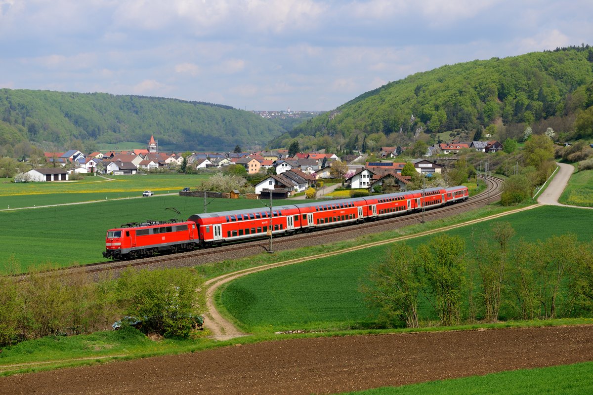 Nahverkehr im Altmühltal: Stündlich verkehrt ein Doppelstockzug, geführt von einer Lok der Baureihe 111, von München nach Nürnberg und umgekehrt. Am 29. April 2015 wurde stellvertretend 111 182 mit ihrer RB 59152 nach Nürnberg HBF bei Breiterfurt aufgenommen. Christoph Schneider