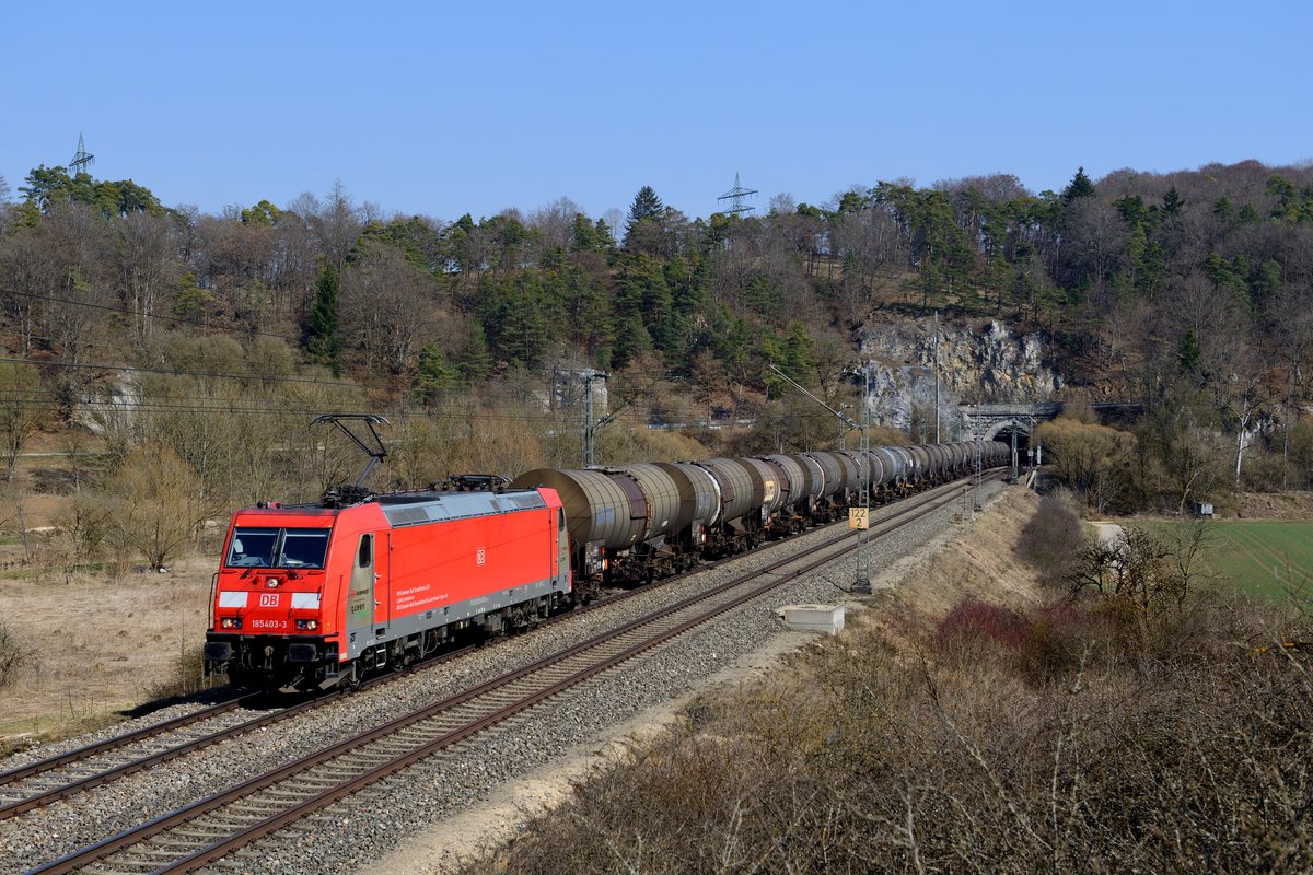 Auch DB Schenker mischt im Mineralöl-Verkehr von und zu den Raffinerien im Raum Ingolstadt mit. Am 20. März 2015 war die 185 403 mit einem Kesselwagen-Ganzzug in Richtung Treuchtlingen unterwegs. Beim Verlassen des 633 Meter langen Esslinger Tunnels konnte die Leistung fotografiert werden. Christoph Schneider