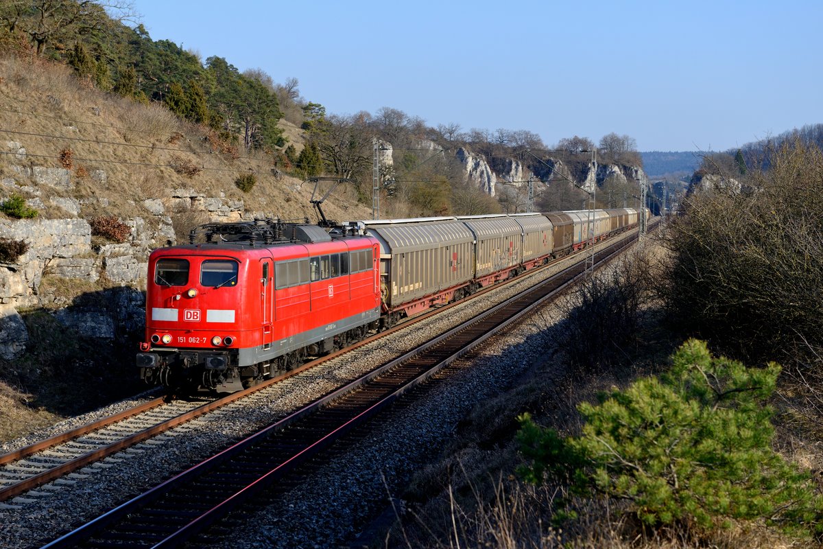 Durch die für das Altmühltal charakteristischen Felsformationen bei Dollnstein eilt 151 125 mit ihrem GA 52860 von Ingolstadt Hbf