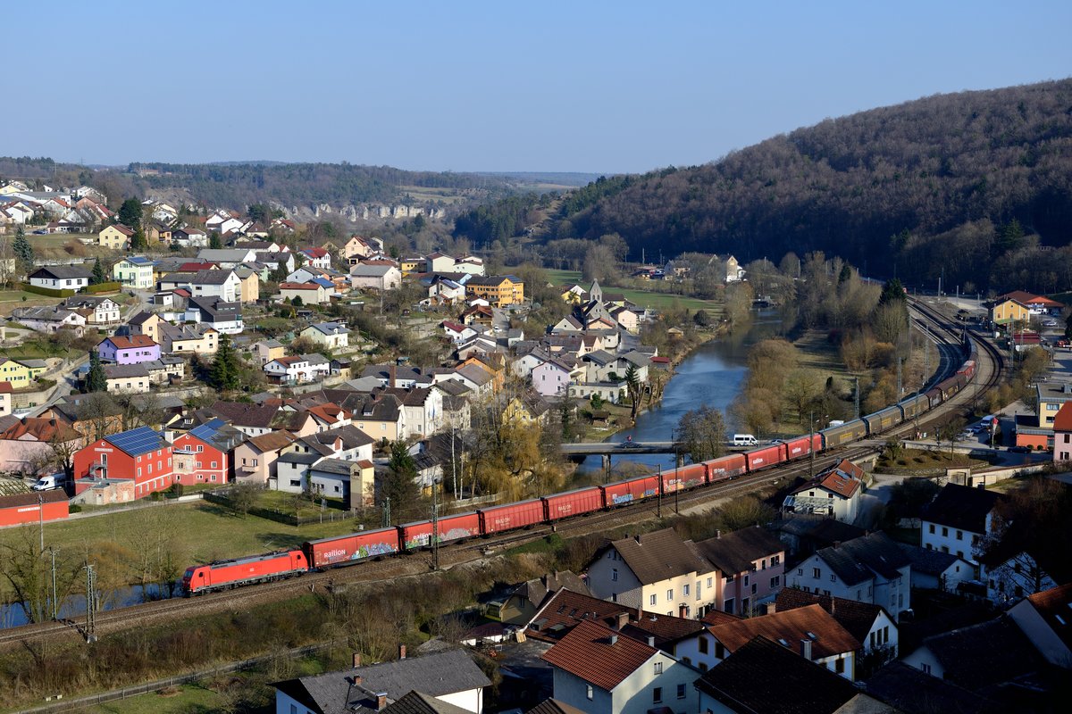 Mit einem langen gemischten Güterzug rauscht 152 075 durch das eisenbahntechnisch sehr ruhig gewordene Altmühltal. Die grandiose Landschaft ist aber immer einen Ausflug dorthin wert, auch wenn einen das dürftige Zugangebot auf eine Geduldsprobe stellt. Für diese Aufnahme habe ich einen Kletterfelsen zwischen Dollnstein und Hagenacker erklommen (10. April 2015). Christoph Schneider