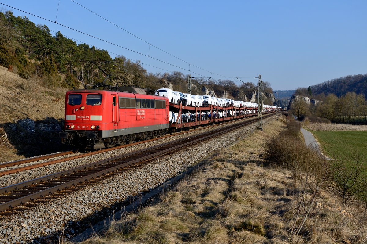 Das Objekt der Begierde: Am 20. März 2015 verkehrte als Sonderleistung der DGS 91107 von Ingolstadt nach Nürnberg Rbf. Für diese Leistung der Firma EGP war die 151 170 von SRI eingeplant. Mit gut 180 Minuten "Plus" konnte der Zug dann am Esslinger Tunnel im Altmühltal fotografiert werden. Leider lies der Wagenpark und der Beladungszustand des Zuges zu wünschen übrig.... trotzdem bin ich froh, eine Aufnahme der aktuell im exotischten Farbkleid befindlichen 151 zu haben. Christoph Schneider