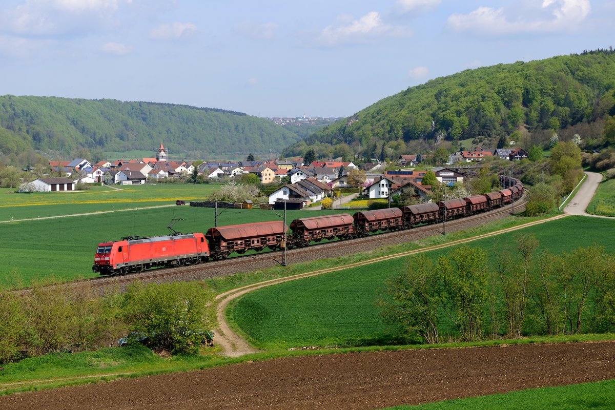 Neben den Raffinerien sorgt das Audi-Werk in Ingolstadt für Verkehr auf der KBS 990. Am 29. April 2015 beförderte 185 148 den GA 52820 Ingolstadt Nord von Kassel Rbf, aufgenommen wurde der mit Neuwagen beladene Ganzzug bei Breiterfurt im Altmühltal. Christoph Schneider