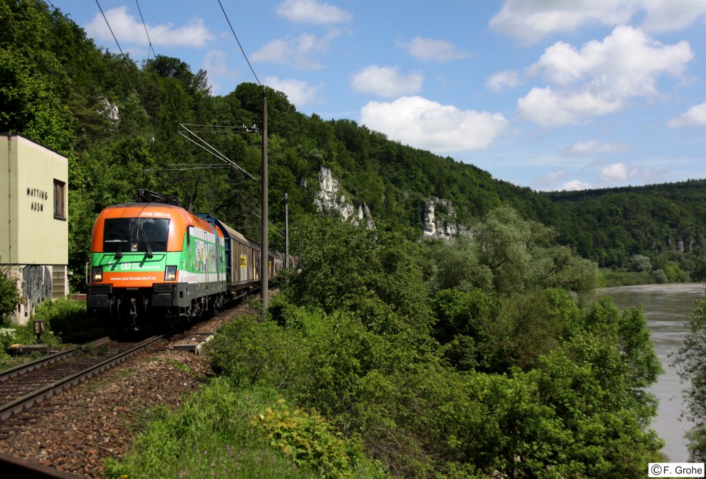 ÖBB 116 007-4 Werbelok SOS Kinderdorf mit Güterzug Richtung Ingolstadt, KBS 993 Regensburg - Ulm, fotografiert an der Ausweichstelle Matting am 04.06.2010 Frank Grohe