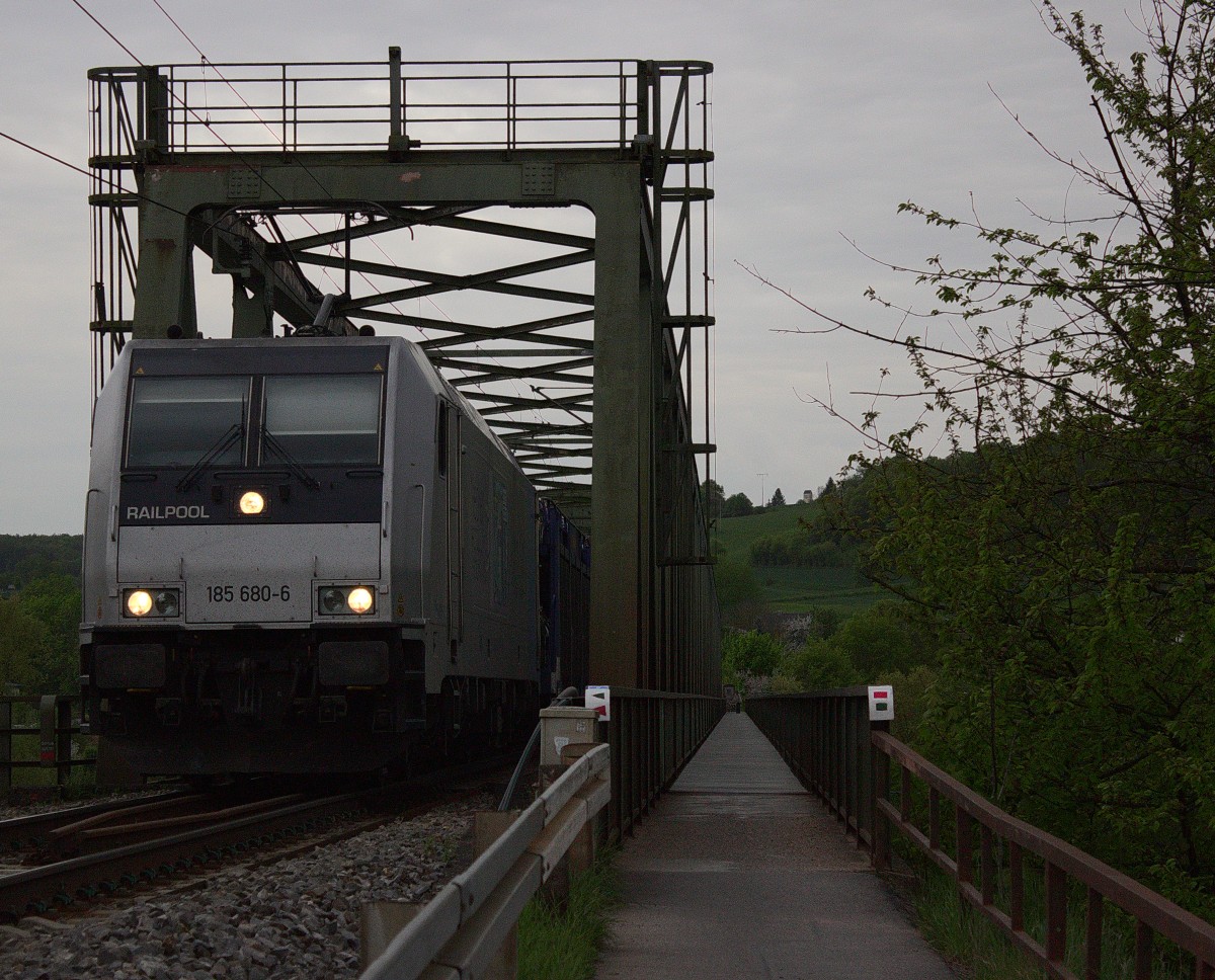 Am 5.5.15 konnte 185 680 mit ihrem Autozug bei der Überfahrt der Sinzinger Donaubrücke festgehalten werden. In Kürze muss die Lok bis zum Stillstand abbremsen, da sie nun mitsamt ihrem Autozug in Prüfening auf die Hauptstrecke muss.