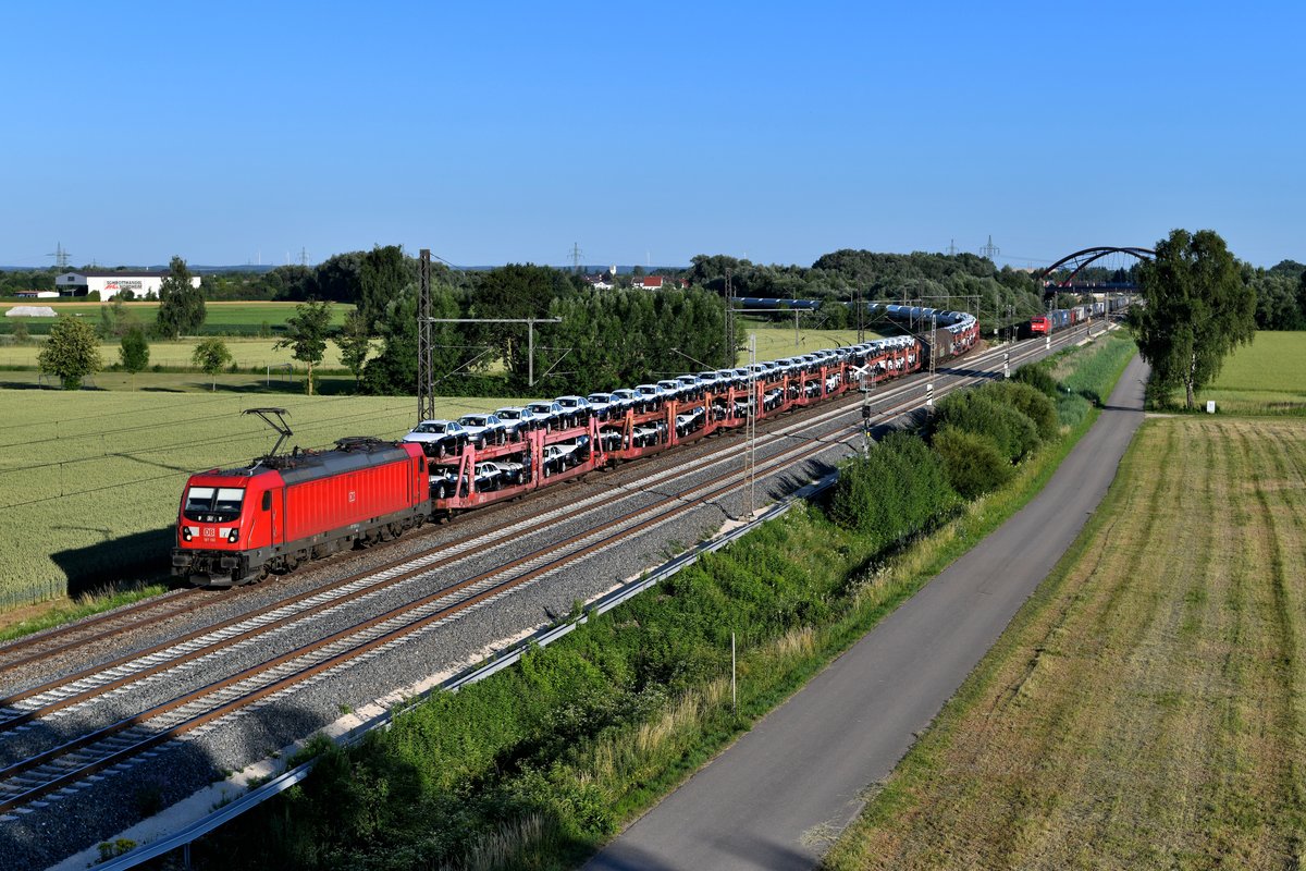 Am Abend des 28. Juni 2019 ergab sich dann noch die Gelegenheit, bei Nordheim eine seltene Betriebssituation aufzunehmen. Die 187 100 kam mit einen gemischten Güterzug aus Ingolstadt über die Donautalbahn eingefahren. Die Leistung wurde aufgrund einer baustellbedingten Streckensperrung im Altmühltal umgeleitet. Im Hintergrund wartete eine 152 mit einem KLV am rot zeigenden Einfahrsignal. Christoph Schneider