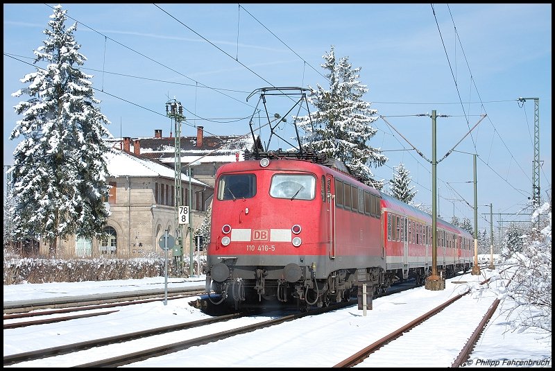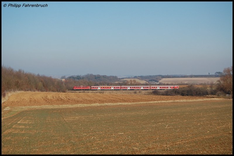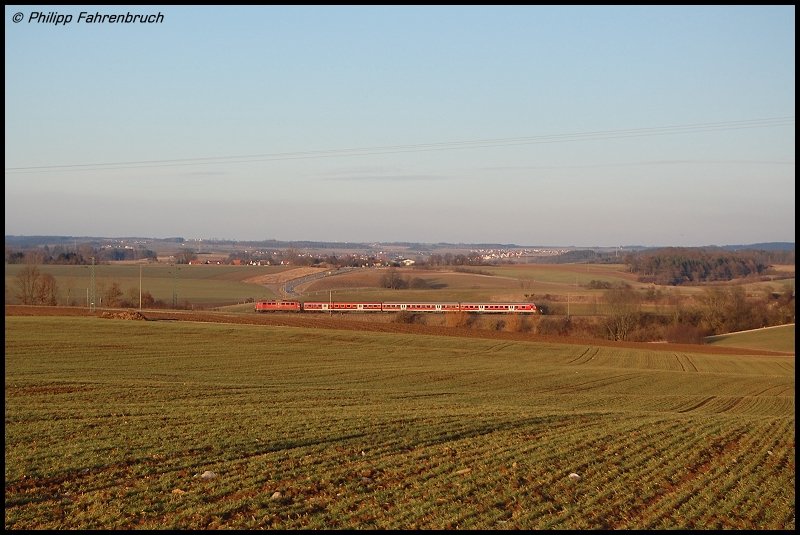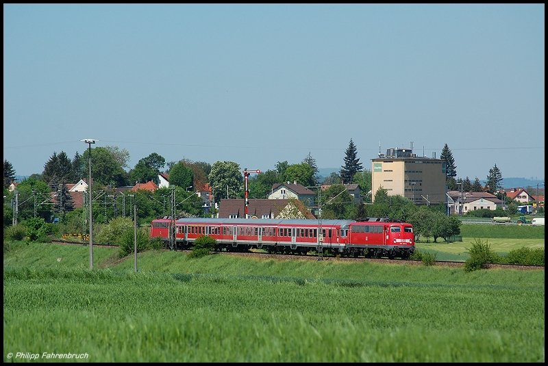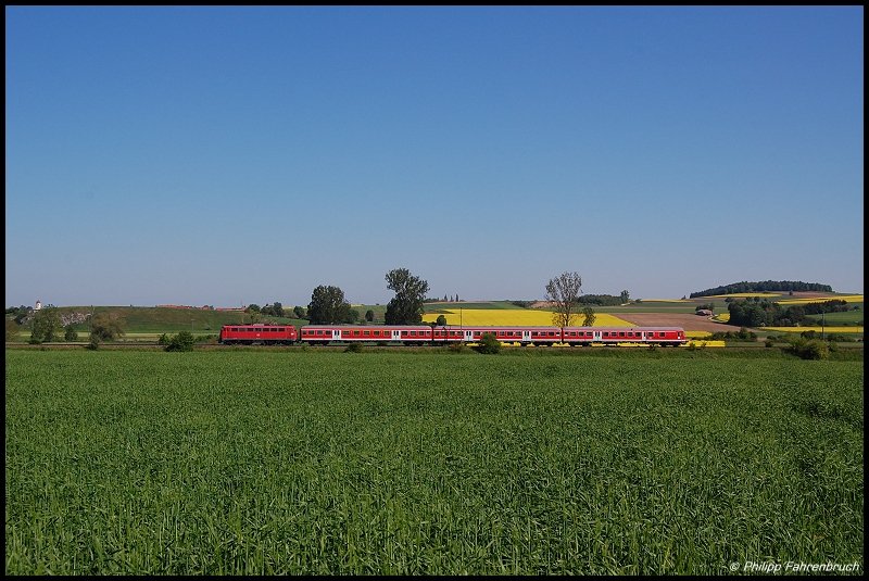110 508 befördert zur Mittagszeit des 13.05.08 RB 37156 von Donauwörth nach Aalen, aufgenommen bei Nördlingen an der Riesbahn (KBS 995). Am Zugschluss läuft 110 425 abgebügelt mit. Der nächste Halt des Zuges ist Pflaumloch. P.F.